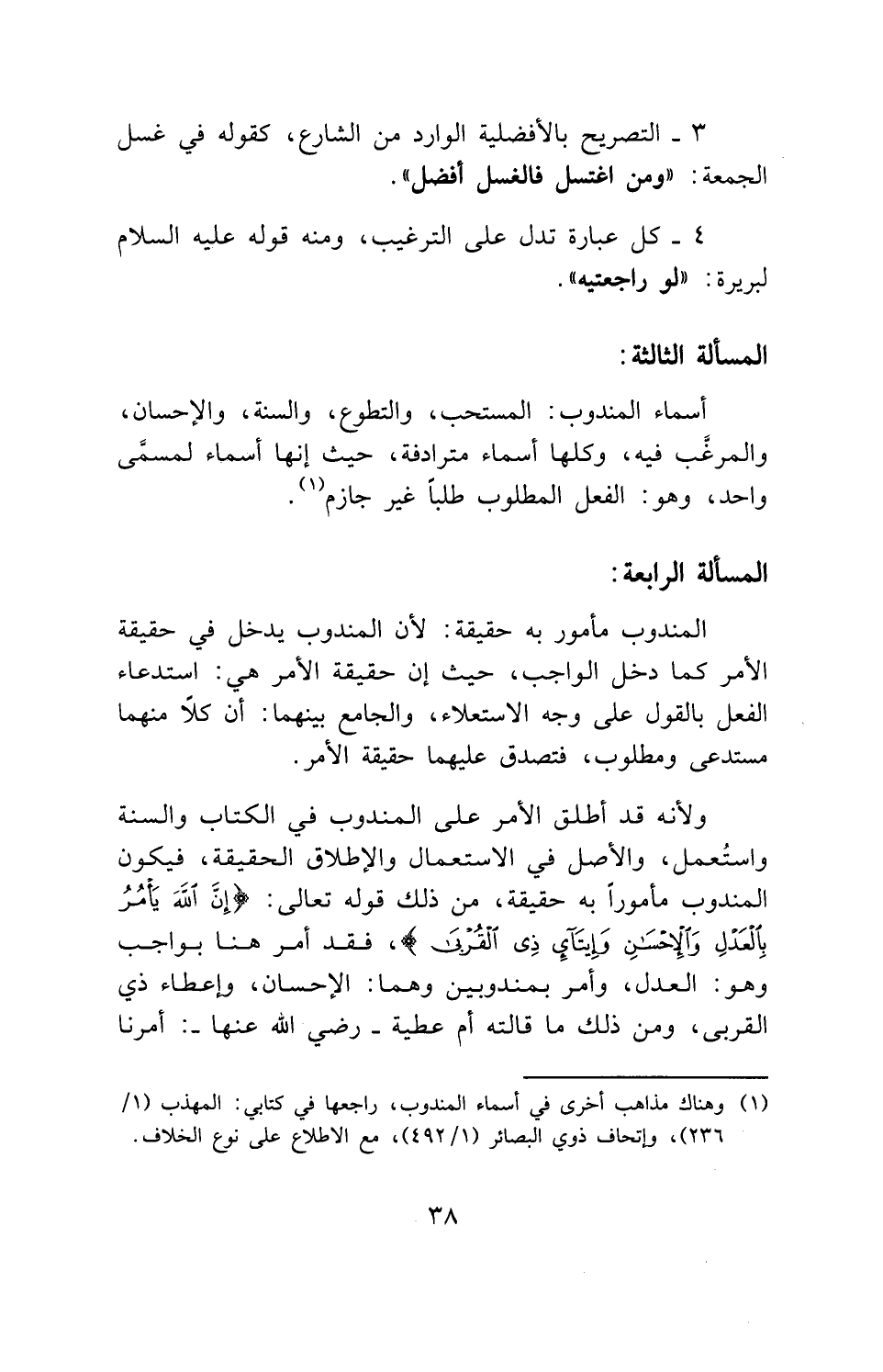 ولأنه قد أطلق الأمر على المندوب في الكتاب والسنة واستُعمل، والأصل في الاستعمال والإطلاق الحقيقة، فيكون المندوب مأموراً به حقيقة، من ذلك قوله تعالى: (إِنَّ اللَّهَ يَأْمُرُ بِالْعَدْلِ وَالْإِحْسَانِ وَإِيتَاءِ ذِي الْقُرْبَى)، فقد أمر هنا بواجب وهو: العدل، وأمر بمندوبين وهما: الإحسان، وإعطاء ذي القربى، ومن ذلك ما قالته أم عطية - رضي الله عنها -: أمرنا