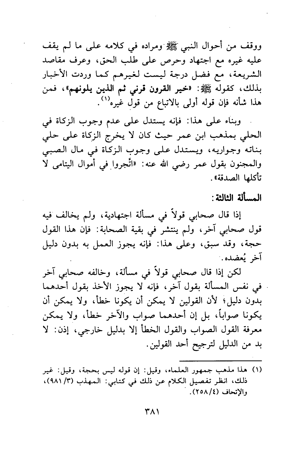 وبناء على هذا: فإنه يستدل على عدم وجوب الزكاة في الحلي بمذهب ابن عمر حيث كان لا يخرج الزكاة على حلي بناته وجواريه، ويستدل على وجوب الزكاة في مال الصبي والمجنون بقول عمر رضي الله عنه: " اتجروا في أموال اليتامى لا تأكلها الصدقة ".