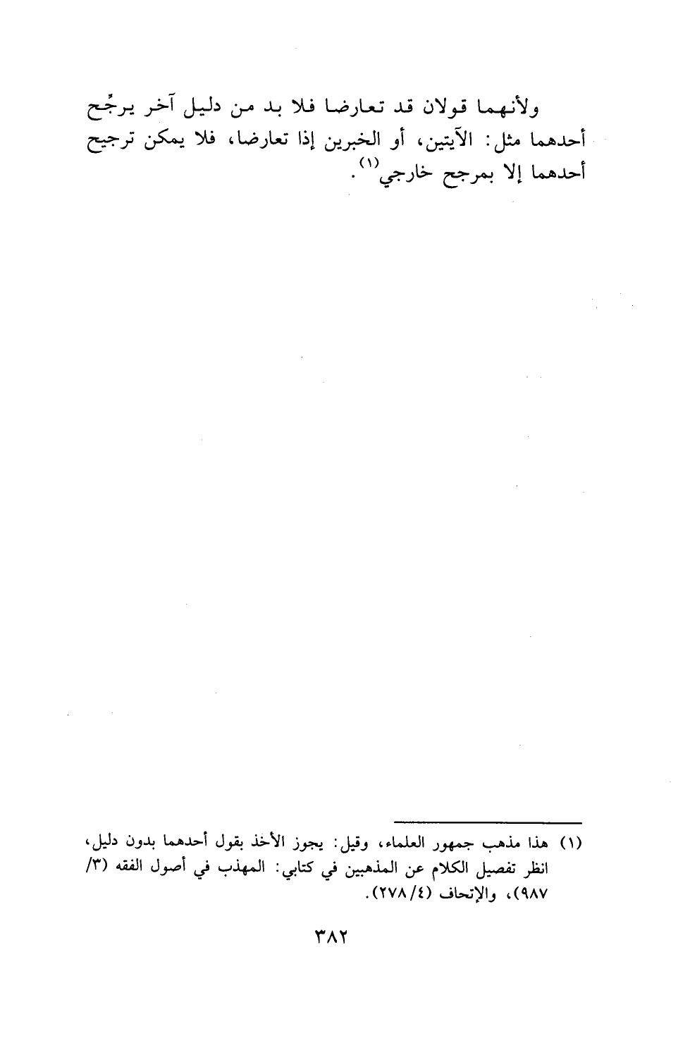 ولأنهما قولان قد تعارضا فلا بد من دليل آخر يرجح أحدهما مثل: الآيتين، أو الخبرين إذا تعارضا، فلا يمكن ترجيح أحدهما إلا بمرجح خارجي.