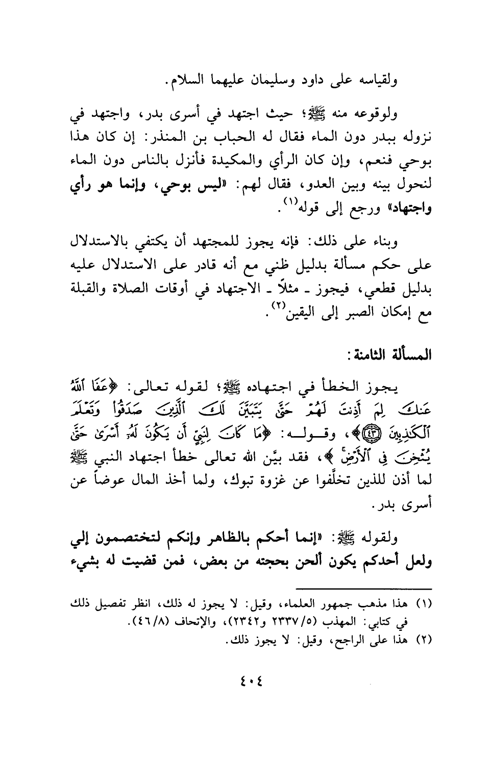 يجوز الخطأ فى اجتهاده - صلى الله عليه وسلم -، لقوله تعالى: (عَفَا اللَّهُ عَنْكَ لِمَ أَذِنْتَ لَهُمْ حَتَّى يَتَبَيَّنَ لَكَ الَّذِينَ صَدَقُوا وَتَعْلَمَ الْكَاذِبِينَ (٤٣))، وقوله: (مَا كَانَ لِنَبِيٍّ أَنْ يَكُونَ لَهُ أَسْرَى حَتَّى يُثْخِنَ فِي الْأَرْضِ)، فقد بين الله تعالى خطأ اجتهاد النبي - صلى الله عليه وسلم - لما أذن للذين تخلَّفوا عن غزوة تبوك، ولما أخذ المال عوضاً عن أسرى بدر.