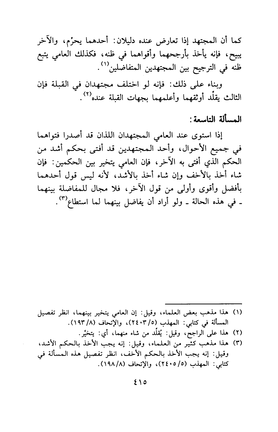 كما أن المجتهد إذا تعارض عنده دليلان: أحدهما يحرِّم، والآخر يبيح، فإنه يأخذ بأرجحهما وأقواهما في ظنه، فكذلك العامي يتبع ظنه في الترجيح بين المجتهدين المتفاضلين.
