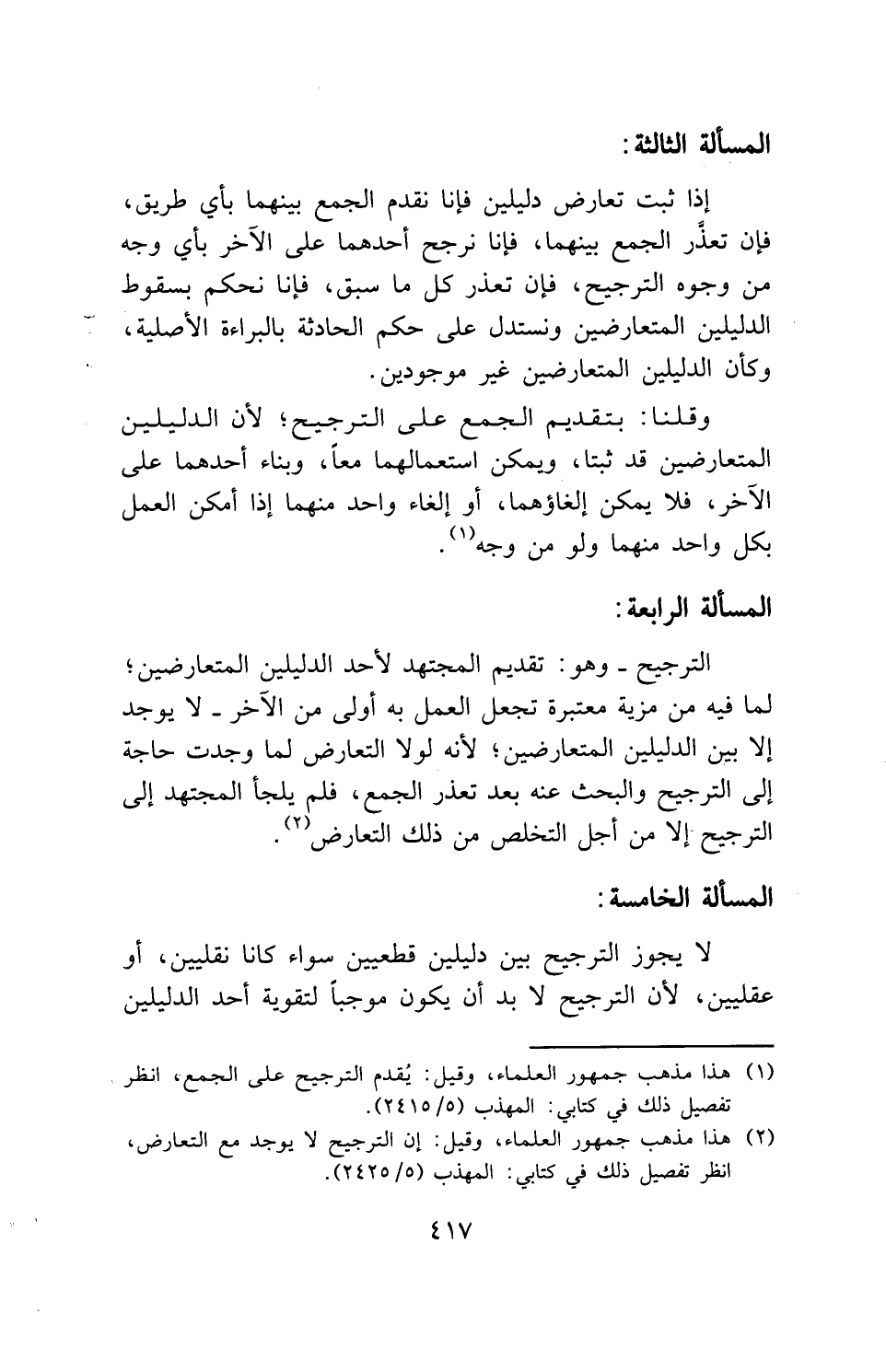 إذا ثبت تعارض دليلين فإنا نقدم الجمع بينهما بأي طريق، فإن تعذر الجمع بينهما، فإنا نرجح أحدهما على الآخر بأي وجه من وجوه الترجيح، فإن تعذر كل ما سبق، فإنا نحكم بسقوط الدليلين المتعارضين ونستدل على حكم الحادثة بالبراءة الأصلية، وكأن الدليلين المتعارضين غير موجودين.
