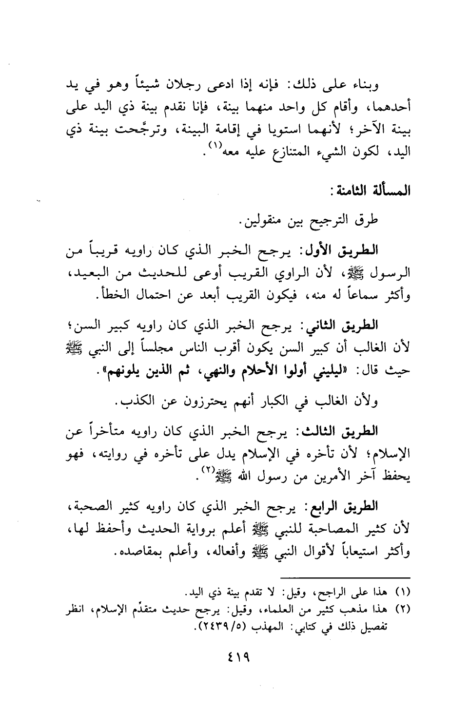 الطريق الثاني: يرجح الخبر الذي كان راويه كبير السن؛ لأن الغالب أن كبير السن يكون أقرب الناس مجلساً إلى النبي - صلى الله عليه وسلم - حيث قال: " ليليني أولوا الأحلام والنهي، ثم الذين يلونهم ".