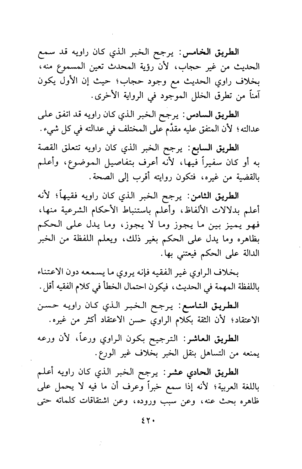 الطريق التاسع: يرجح الخبر الذي كان راويه حسن الاعتقاد؛ لأن الثقة بكلام الراوي حسن الاعتقاد أكثر من غيره.