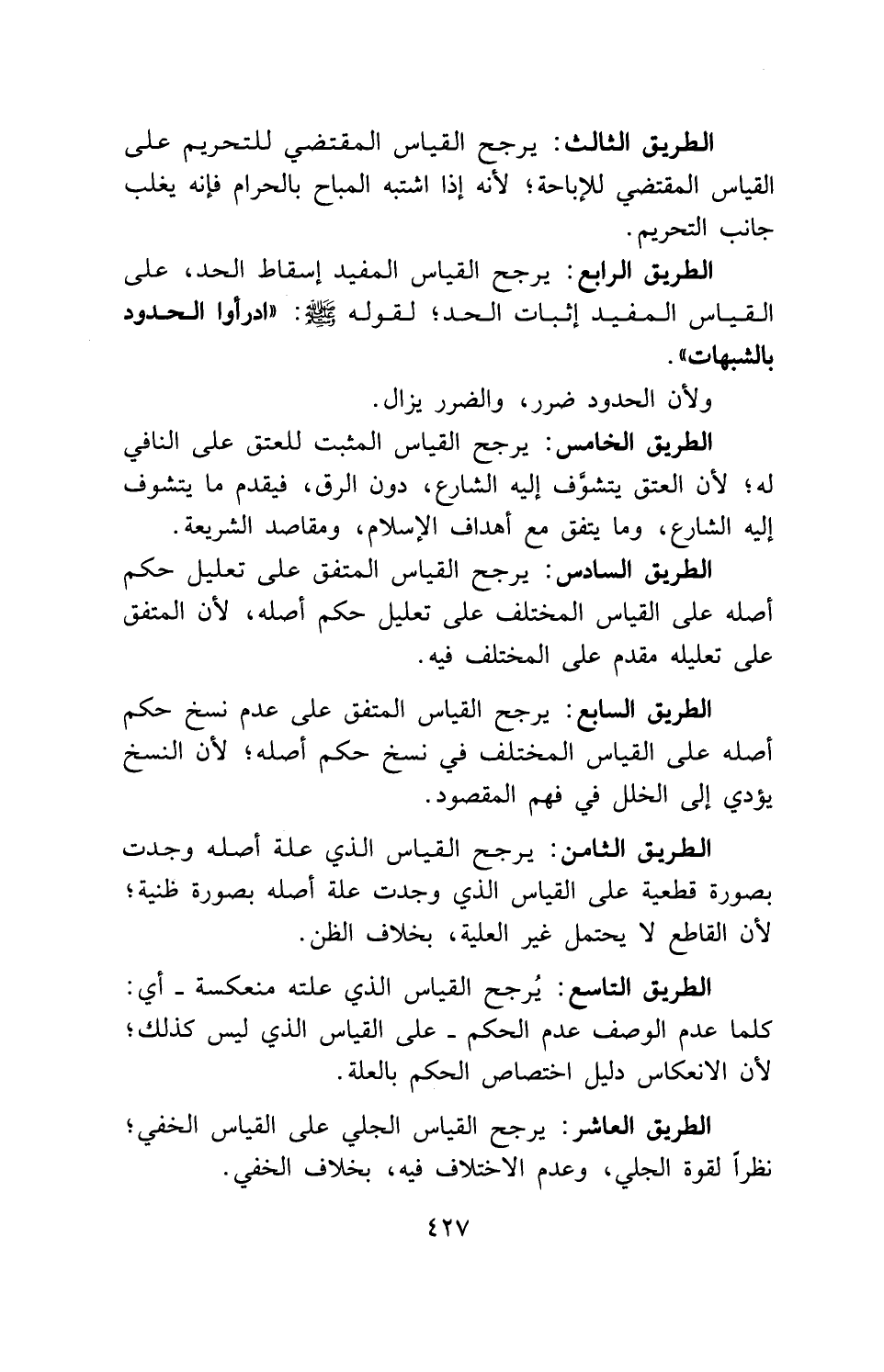 الطريق الرابع: يرجح القياس المفيد إسقاط الحد، على القياس المفيد إثبات الحد؛ لقوله - صلى الله عليه وسلم -: " ادرأوا الحدود بالشبهات ".