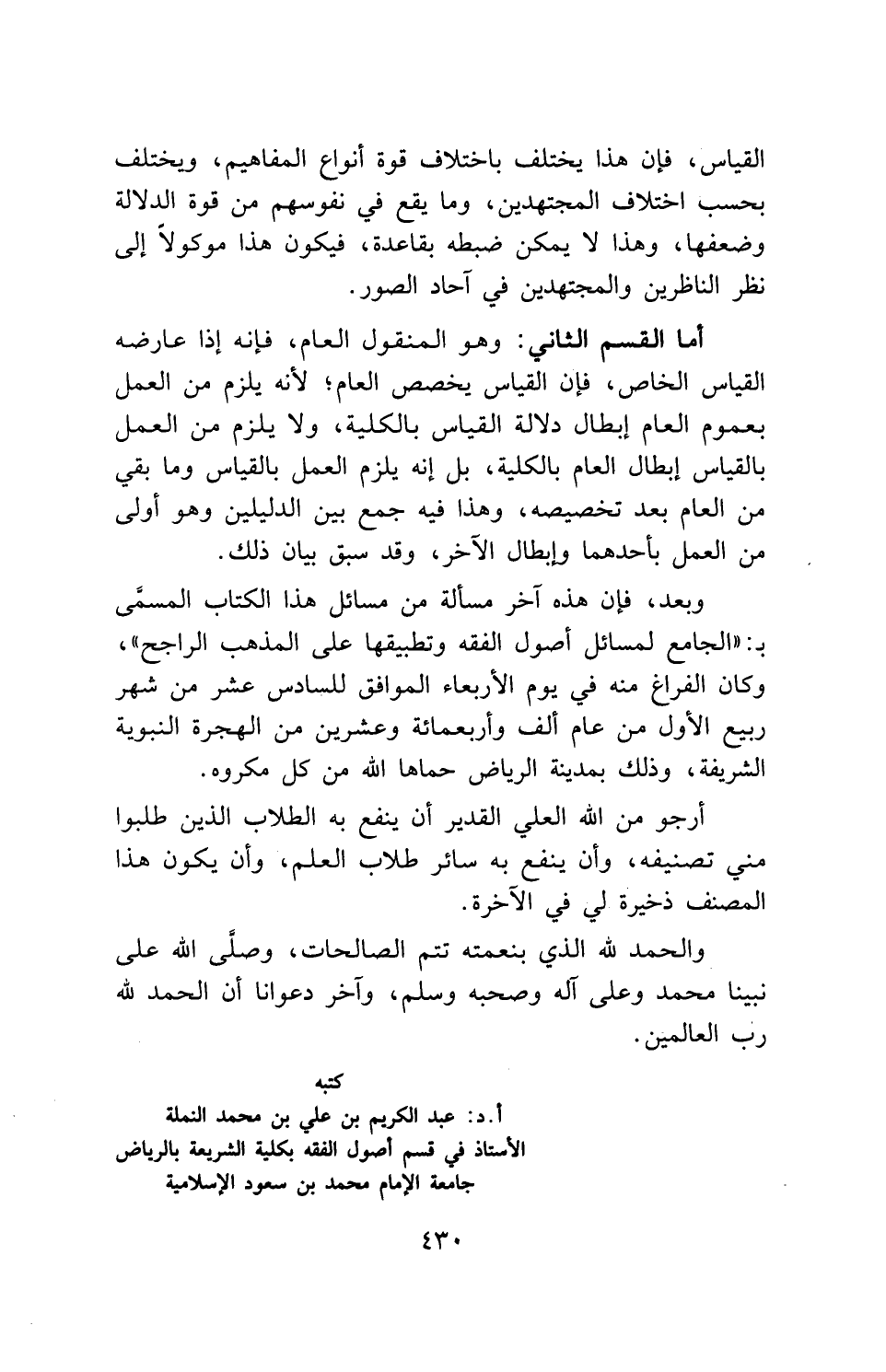 وبعد، فإن هذه آخر مسألة من مسائل هذا الكتاب المسمَّى بـ: " الجامع لمسائل أصول الفقه وتطبيقها على المذهب الراجح "، وكان الفراغ منه في يوم الأربعاء الموافق للسادس عشر من شهر ربيع الأول من عام ألف وأربعمائة وعشرين من الهجرة النبوية الشريفة، وذلك بمدينة الرياض حماها الله من كل مكروه.