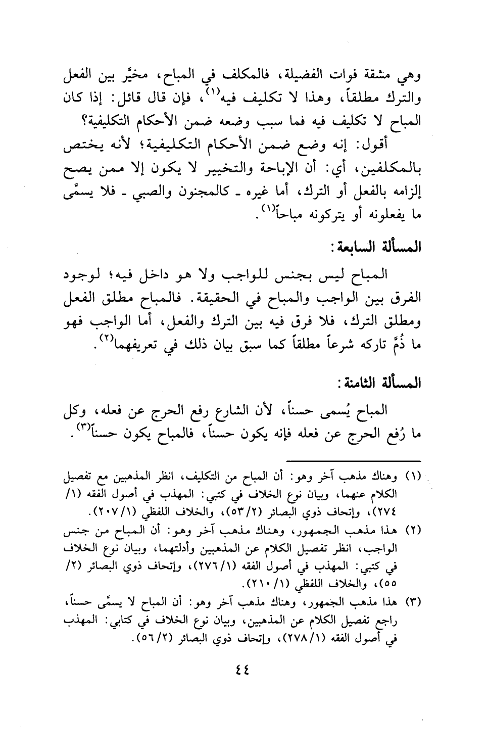 وهي مشقة فوات الفضيلة، فالمكلف في المباح، مخير بين الفعل والترك مطلقاً، وهذا لا تكليف فيه، فإن قال قائل: إذا كان المباح لا تكليف فيه فما سبب وضعه ضمن الأحكام التكليفية؟