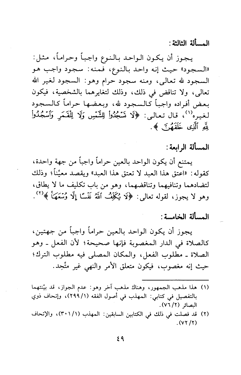 يجوز أن يكون الواحد بالنوع واجباً وحراماً، مثل: " السجود " حيث إنه واحد بالنوع، فمنه: سجود واجب هو السجود لله تعالى، ومنه سجود حرام وهو: السجود لغير الله تعالى، ولا تناقض في ذلك، وذلك لتغايرهما بالشخصية، فيكون بعض أفراده واجباً كالسجود لله، وبعضها حراماً كالسجود لغيره، قال تعالى: (لَا تَسْجُدُوا لِلشَّمْسِ وَلَا لِلْقَمَرِ وَاسْجُدُوا لِلَّهِ الَّذِي خَلَقَهُنَّ).