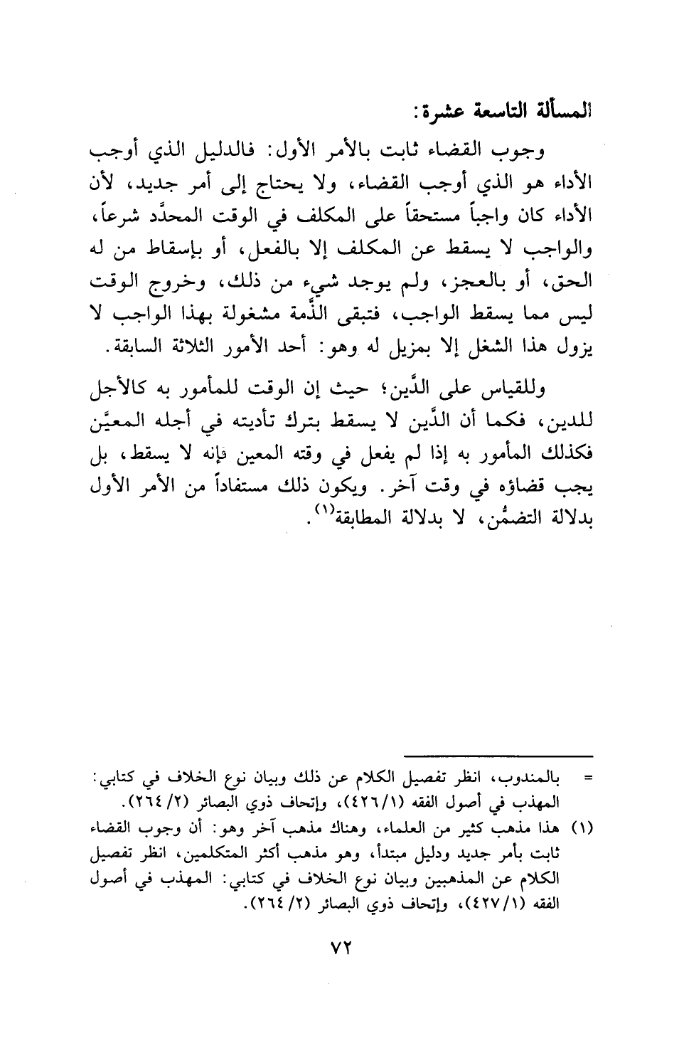 وللقياس على الذين؛ حيث إن الوقت للمأمور به كالأجل للدين، فكما أن الدَّين لا يسقط بترك تأديته في أجله المعيَّن فكذلك المأمور به إذا لم يفعل في وقته المعين كأنه لا يسقط، بل يجب قضاؤه في وقت آخر. ويكون ذلك مستفاداً من الأمر الأول بدلالة التضمن، لا بدلالة المطابقة.