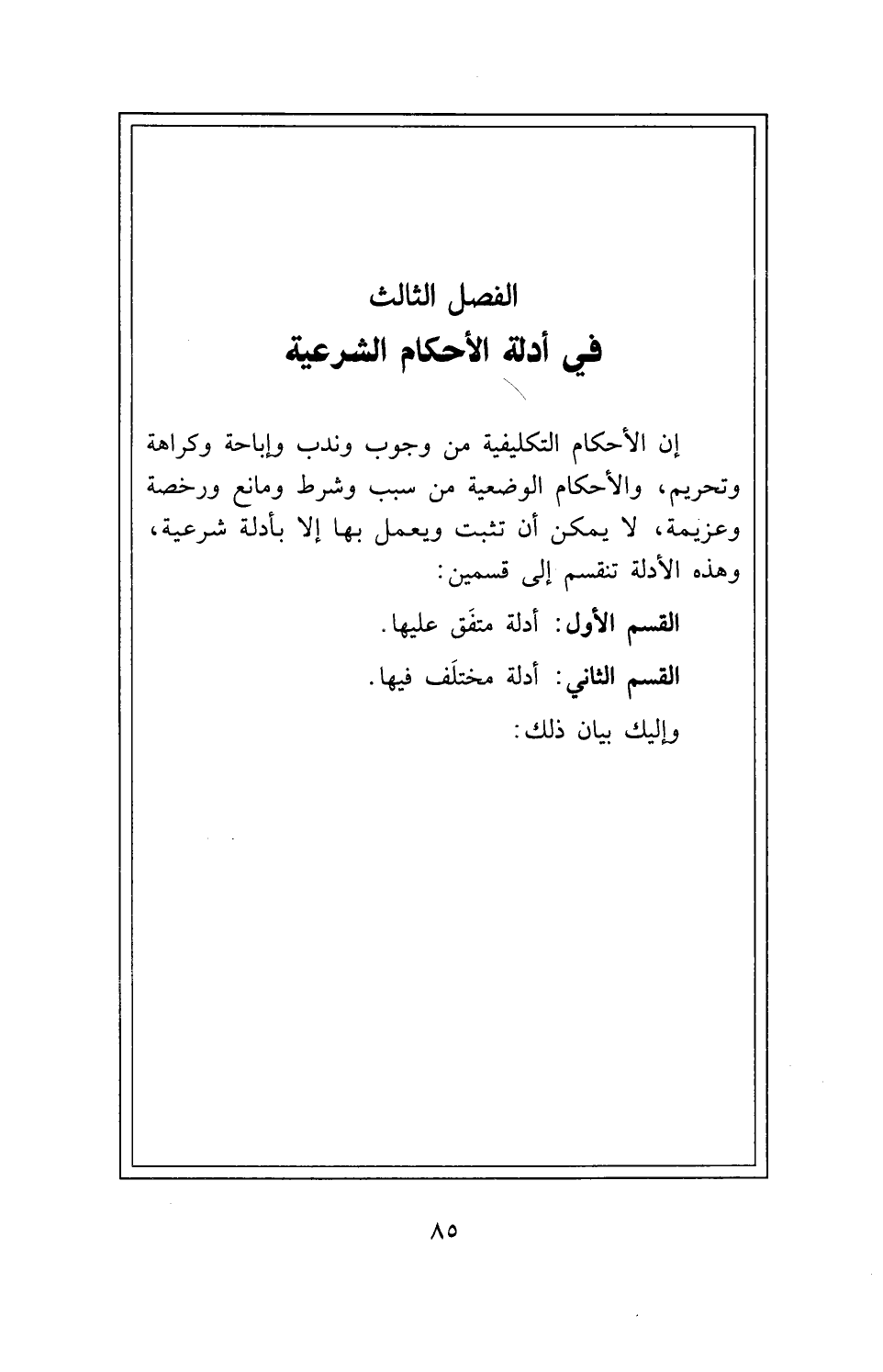 إن الأحكام التكليفية من وجوب وندب وإباحة وكراهة وتحريم، والأحكام الوضعية من سبب وشرط ومانع ورخصة وعزيمة، لا يمكن أن تثبت ويعمل بها إلا بأدلة شرعية، وهذه الأدلة تنقسم إلى قسمين: