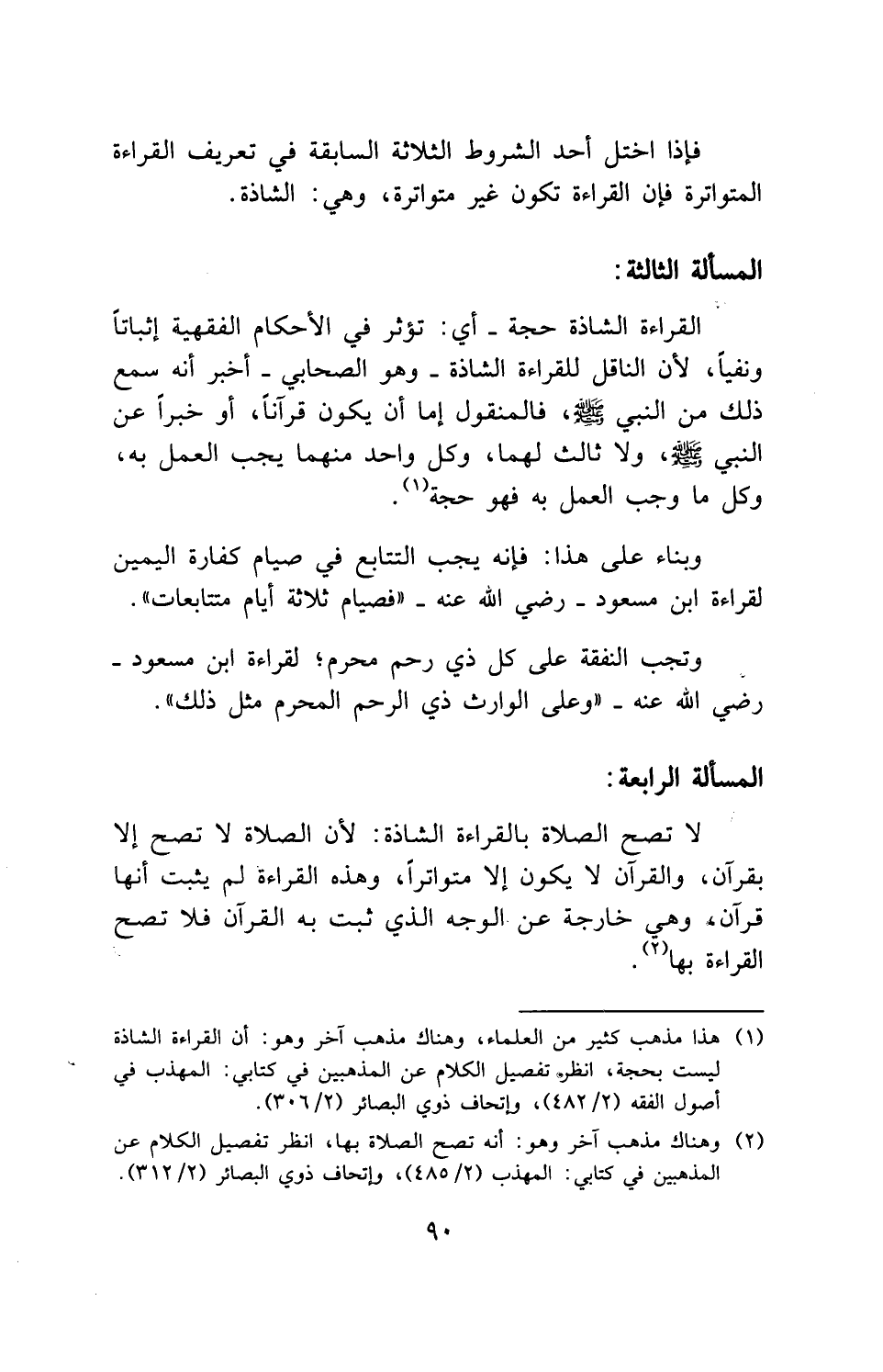 القراءة الشاذة حجة - أي: تؤثر في الأحكام الفقهية إثباتاً ونفياً، لأن الناقل للقراءة الشاذة - وهو الصحابي - أخبر أنه سمع ذلك من النبي - صلى الله عليه وسلم -، فالمنقول إما أن يكون قرآناً، أو خبراً عن النبي - صلى الله عليه وسلم -، ولا ثالث لهما، وكل واحد منهما يجب العمل به، وكل ما وجب العمل به فهو حجة.