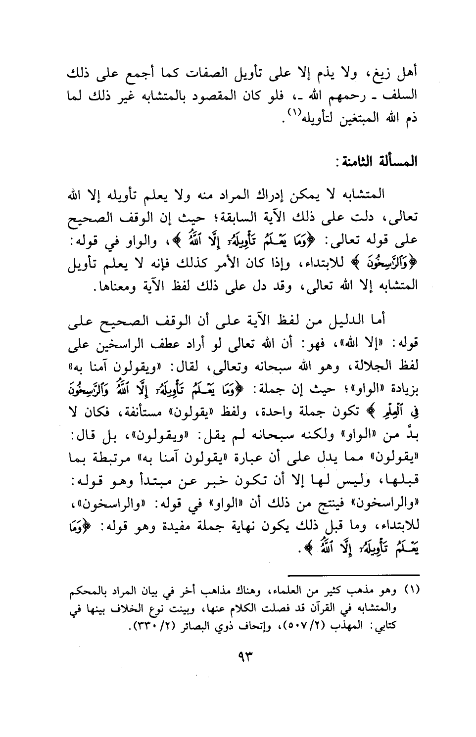 أما الدليل من لفظ الآية على أن الوقف الصحيح على قوله: " إلا الله "، فهو: أن الله تعالى لو أراد عطف الراسخين على لفظ الجلالة، وهو الله سبحانه وتعالى، لقال: " ويقولون آمنا به " بزيادة " الواو "؛ حيث إن جملة: (وَمَا يَعْلَمُ تَأْوِيلَهُ إِلَّا اللَّهُ وَالرَّاسِخُونَ فِي الْعِلْمِ) تكون جملة واحدة، ولفظ " يقولون " مستأنفة، فكان لا بدَّ من " الواو " ولكنه سبحانه لم يقل: " ويقولون "، بل قال: " يقولون " مما يدل على أن عبارة " يقولون آمنا به " مرتبطة بما قبلها، وليس لها إلا أن تكون خبر عن مبتدأ وهو قوله: " والراسخون " فينتج من ذلك أن " الواو " في قوله: " والراسخون "، للابتداء، وما قبل ذلك يكون نهاية جملة مفيدة وهو قوله: (وَمَا يَعْلَمُ تَأْوِيلَهُ إِلَّا اللَّهُ).