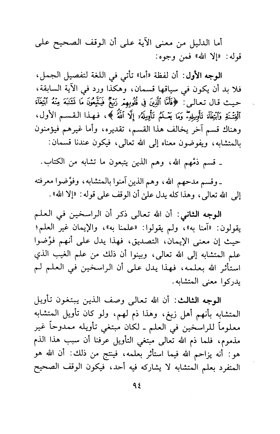 الوجه الثالث: أن الله تعالى وصف الذين يبتغون تأويل المتشابه بأنهم أهل زيغ، وهذا ذم لهم، ولو كان تأويل المتشابه معلوماً للراسخين في العلم - لكان مبتغي تأويله ممدوحاً غير مذموم، فلما ذم الله تعالى مبتغي التأويل عرفنا أن سبب هذا الذم هو: أنه يزاحم الله فيما استأثر بعلمه، فينتج من ذلك: أن الله هو المتفرد بعلم المتشابه لا يشاركه فيه أحد، فيكون الوقف الصحيح