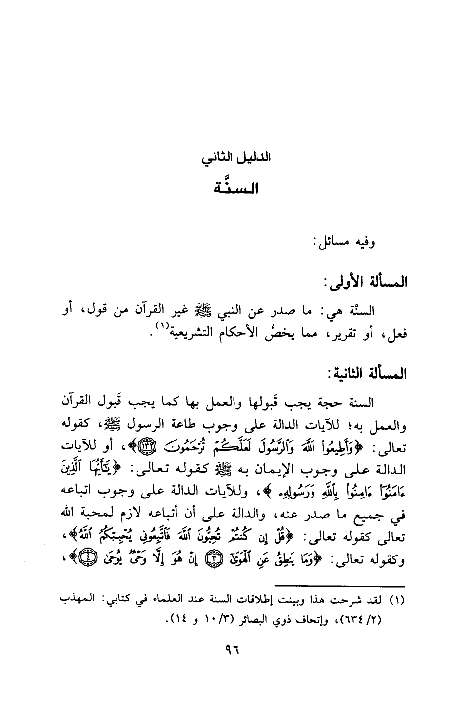 السنة حجة يجب قَبولها والعمل بها كما يجب قَبول القرآن والعمل به؛ للآيات الدالة على وجوب طاعة الرسول - صلى الله عليه وسلم -، كقوله تعالى: (وَأَطِيعُوا اللَّهَ وَالرَّسُولَ لَعَلَّكُمْ تُرْحَمُونَ (١٣٢))، أو للآيات الدالة على وجوب الإيمان به - صلى الله عليه وسلم - كقوله تعالى: (يَا أَيُّهَا الَّذِينَ آمَنُوا آمِنُوا بِاللَّهِ وَرَسُولِهِ)، وللآيات الدالة على وجوب اتباعه في جميع ما صدر عنه، والدالة على أن اتباعه لازم لمحبة الله تعالى كقوله تعالى: (قُلْ إِنْ كُنْتُمْ تُحِبُّونَ اللَّهَ فَاتَّبِعُونِي يُحْبِبْكُمُ اللَّهُ)، وكقوله تعالى: (وَمَا يَنْطِقُ عَنِ الْهَوَى (٣) إِنْ هُوَ إِلَّا وَحْيٌ يُوحَى (٤))،