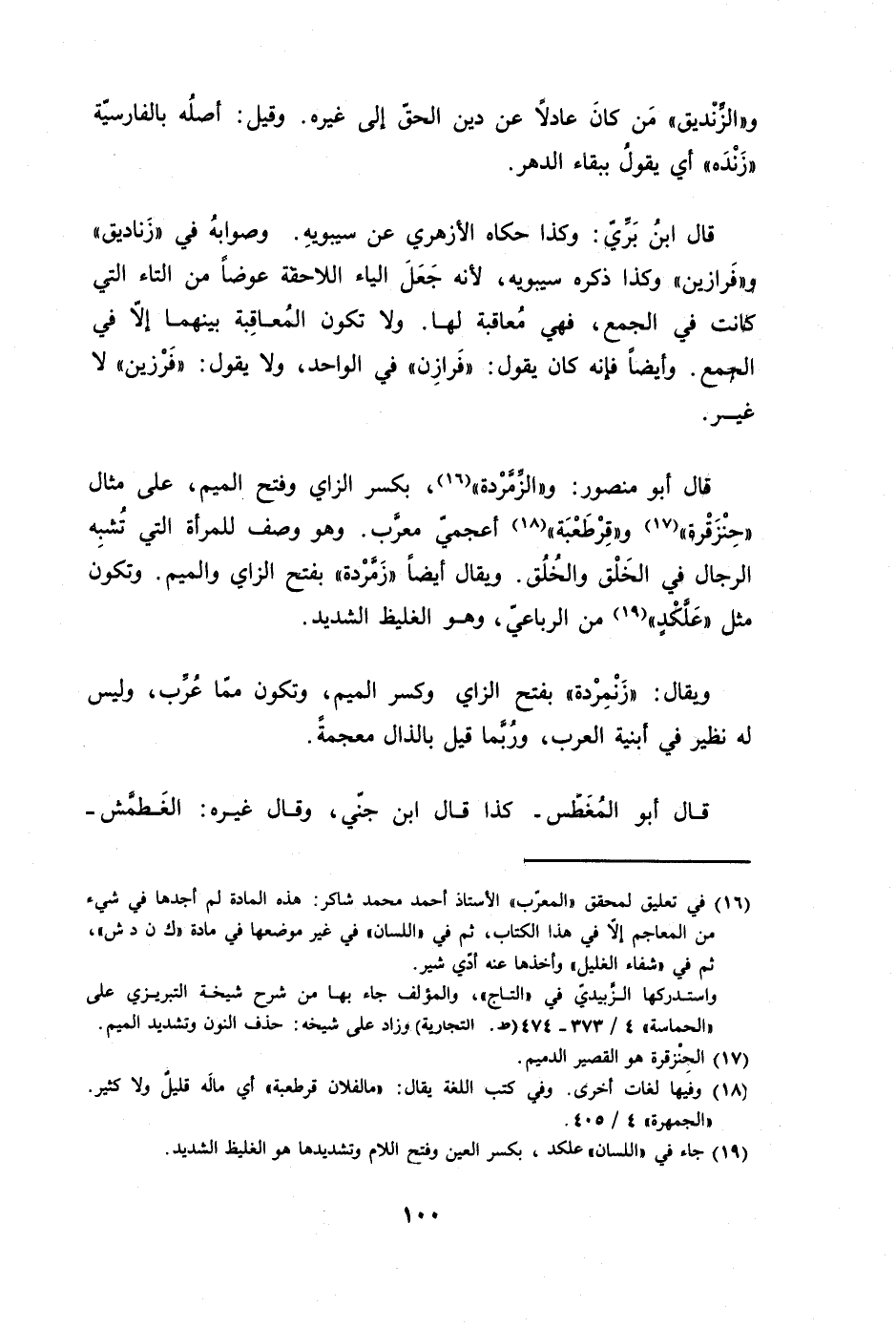 قَالَ ابْن بري وَكَذَا حَكَاهُ الْأَزْهَرِي عَن سِيبَوَيْهٍ وَصَوَابه فِي زناديق وفرازين وَكَذَا ذكره سِيبَوَيْهٍ لِأَنَّهُ جعل الْيَاء اللاحقة عوضا من التَّاء الَّتِي كَانَت فِي الْجمع فَهِيَ معاقبة لَهَا وَلَا تكون المعاقبة بَينهمَا إِلَّا فِي الْجمع وَأَيْضًا فَإِنَّهُ كَانَ يَقُول فرازن فِي الْوَاحِد وَلَا يَقُول فرزين لَا غير