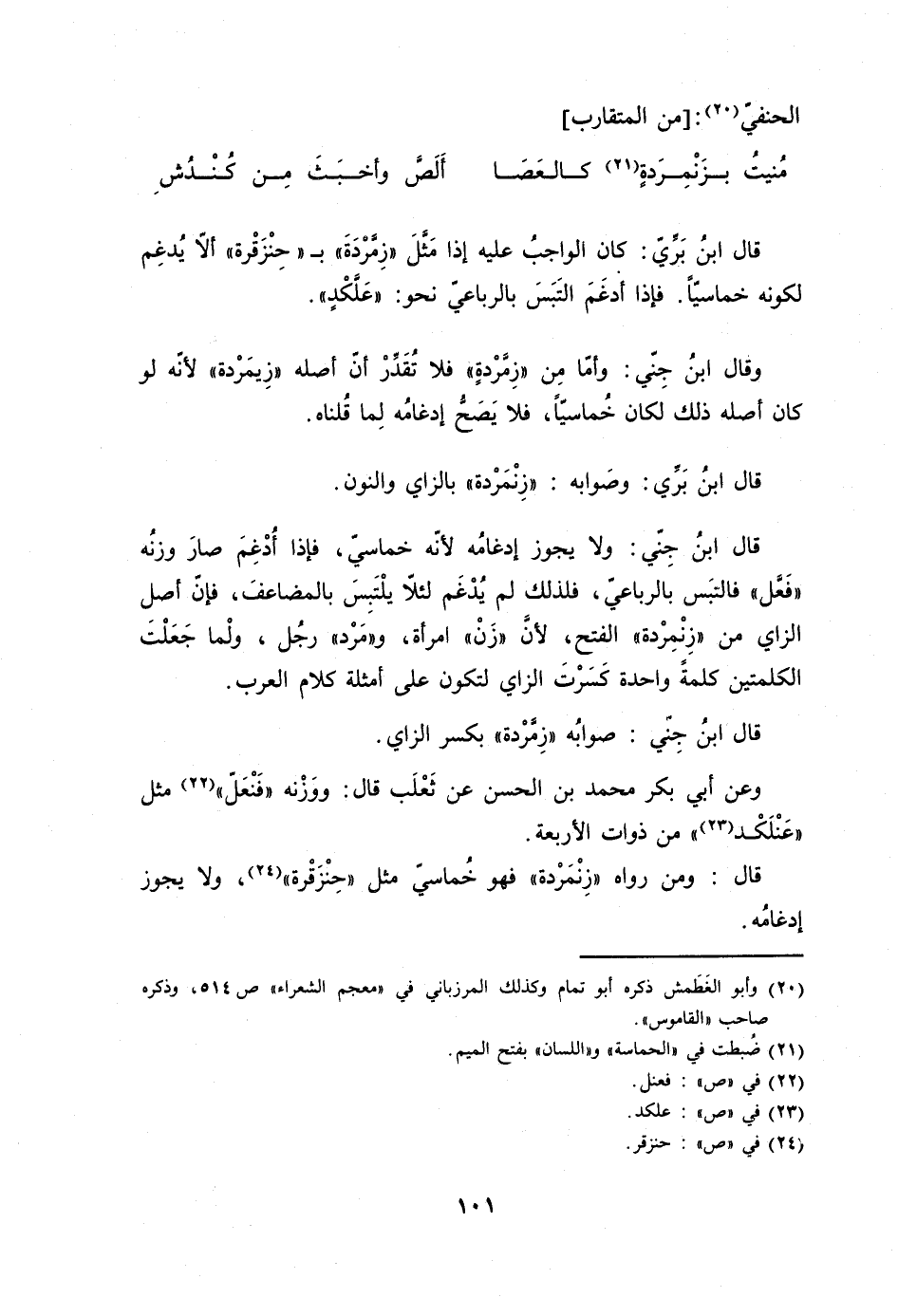 قَالَ ابْن جني وَلَا يجوز إدغامه لِأَنَّهُ خماسي فَإِذا أدغم صَار وَزنه فعل فَالْتبسَ بالرباعي فَلذَلِك لم يدغم لِئَلَّا يلتبس بالمضاعف فَإِن اصل الزَّاي من زنمردة الْفَتْح لِأَن زن امْرَأَة ومرد رجل وَلما جعلت الْكَلِمَتَيْنِ كلمة وَاحِدَة كسرت الزَّاي لتَكون على أَمْثِلَة كَلَام الْعَرَب