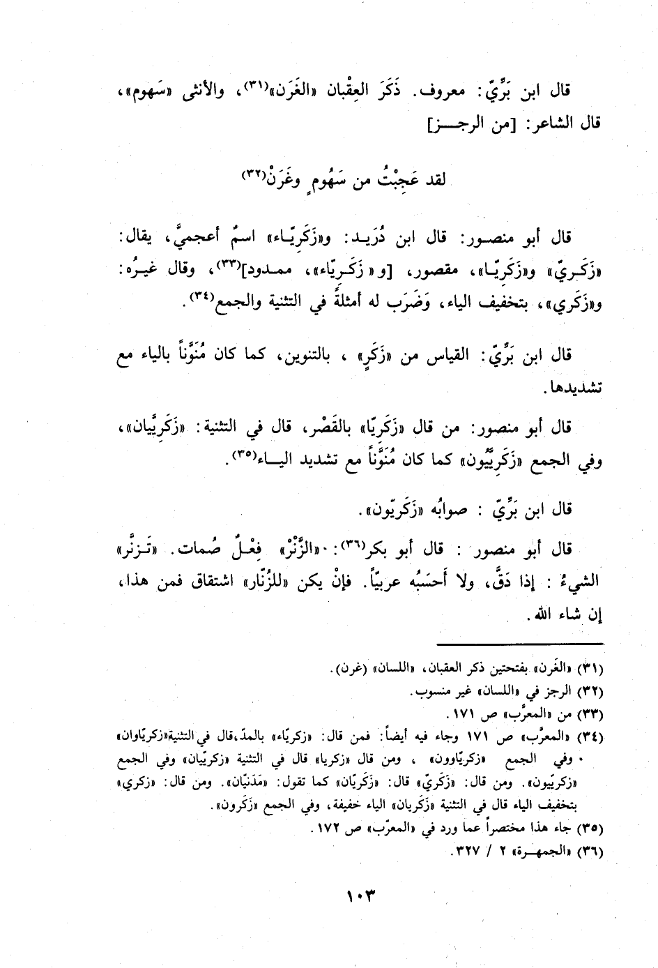 قَالَ ابْن بري الْقيَاس من زكر بِالتَّنْوِينِ كَمَا كَانَ منونا بِالْيَاءِ مَعَ تشديدها