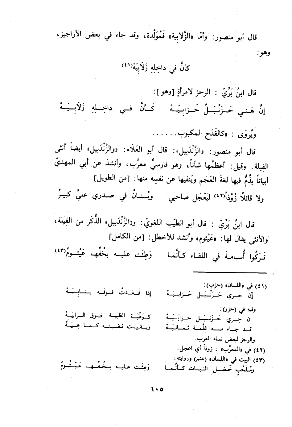 قَالَ أَبُو مَنْصُور الزندبيل قَالَ أَبُو الْعَلَاء والزندبيل أَيْضا أُنْثَى الفيلة وَقيل أعظمها شَأْنًا وَهُوَ فَارسي مُعرب وَأنْشد عَن أبي الْمهْدي أبياتا يذم فِيهَا لُغَة الْعَجم وينفيها عَن نَفسه مِنْهَا