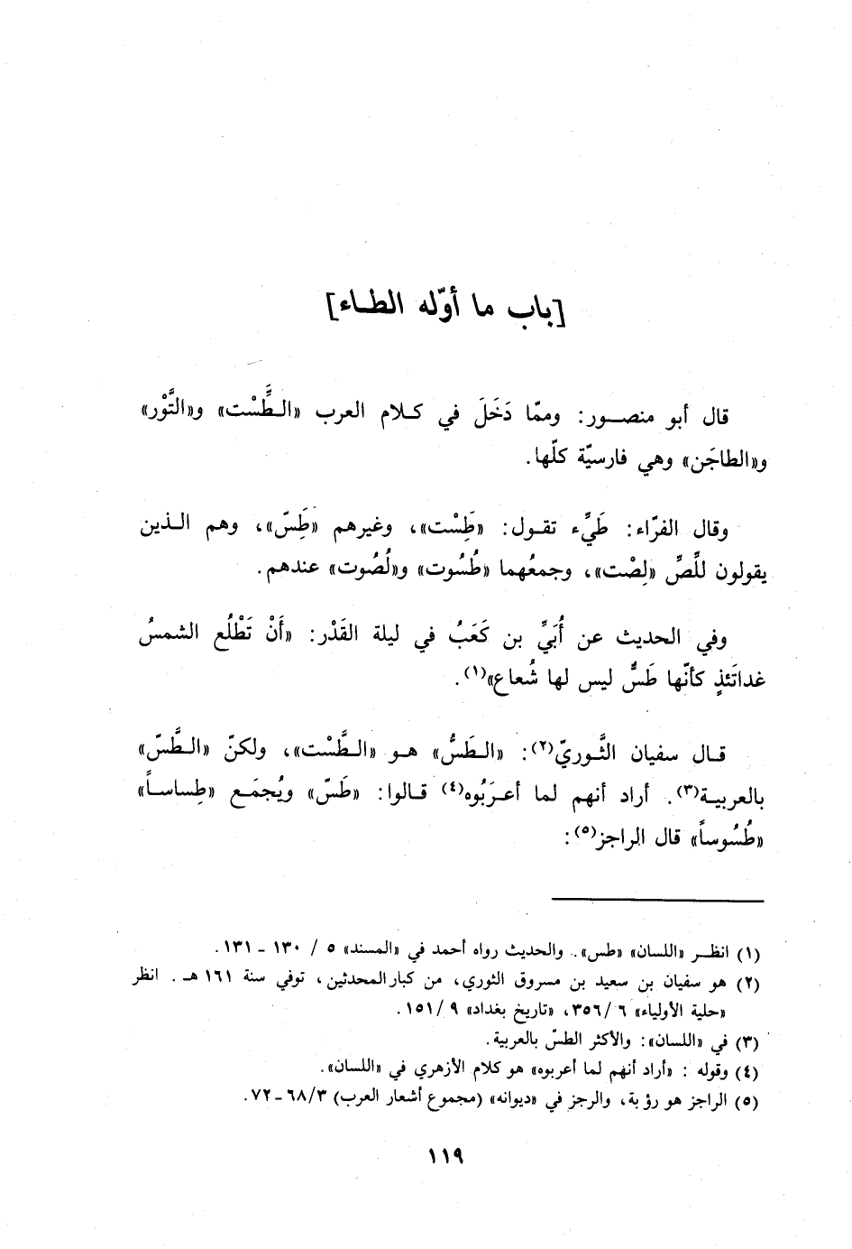 قَالَ سُفْيَان الثَّوْريّ الطس هُوَ الطست وَلَكِن الطس بِالْعَرَبِيَّةِ أَرَادَ أَنهم لما أعربوه قَالُوا طس وَيجمع طساسا طسوسا قَالَ الراجز