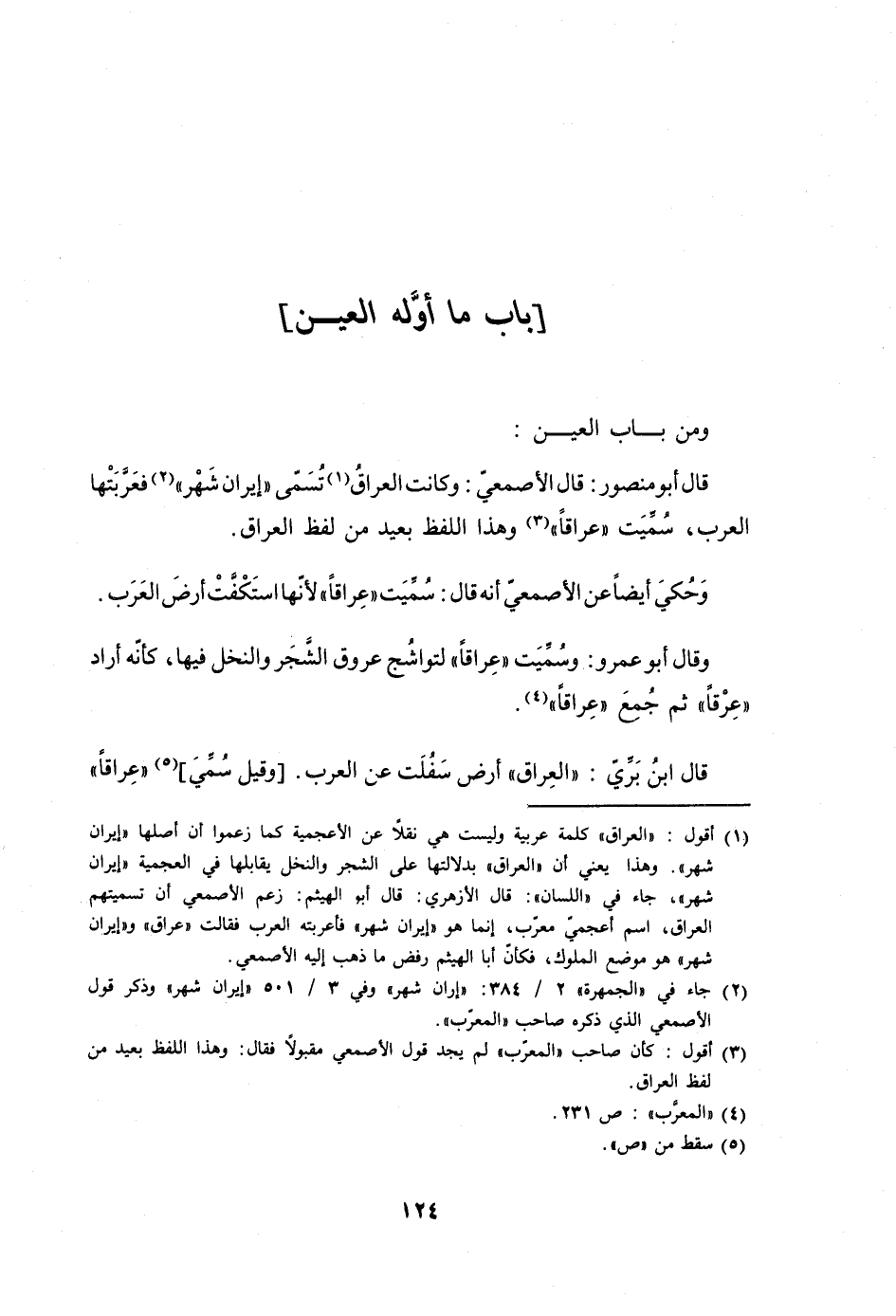 قَالَ أَبُو مَنْصُور قَالَ الْأَصْمَعِي وَكَانَت الْعرَاق تسمى إيران شهر فعربتها الْعَرَب سميت عراقا وَهَذَا اللَّفْظ بعيد من لفظ الْعرَاق