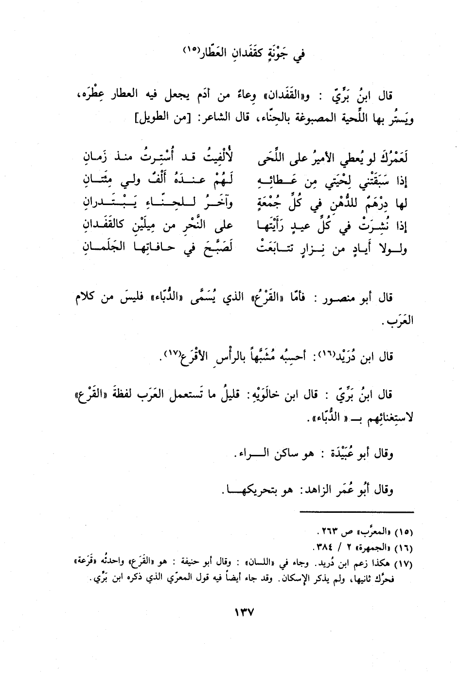 قَالَ ابْن بري والقفدان وعَاء من آدم يَجْعَل فِيهِ الْعَطَّار عطره وَيسْتر بهَا اللِّحْيَة المصبوغة بِالْحِنَّاءِ قَالَ الشَّاعِر