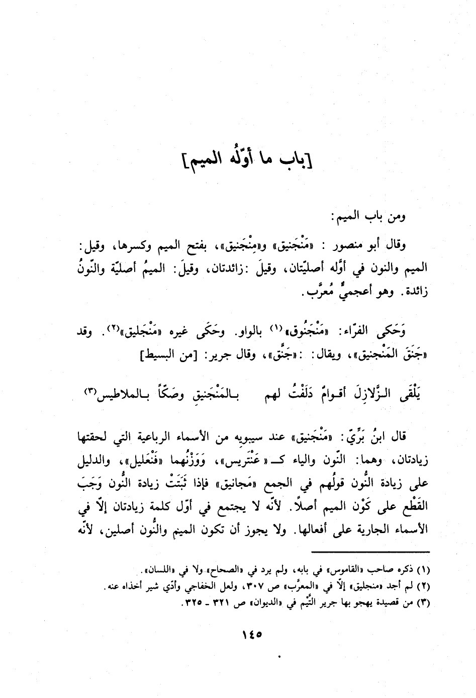 قَالَ ابْن بري منجنيق عِنْد سِيبَوَيْهٍ من الْأَسْمَاء الرّبَاعِيّة الَّتِي لحقتها زيادتان وهما النُّون وَالْيَاء ك عنتريس ووزنهما فنعليل وَالدَّلِيل على زِيَادَة النُّون قَوْلهم فِي الْجمع مجانيق فَإِذا ثبتَتْ زِيَادَة النُّون وَجب الْقطع على كَون الْمِيم أصلا لِأَنَّهُ لَا يجْتَمع فِي أول كلمة زيادتان إِلَّا فِي الْأَسْمَاء الْجَارِيَة على أفعالها وَلَا يجوز أَن تكون الْمِيم وَالنُّون أصلين لِأَنَّهُ