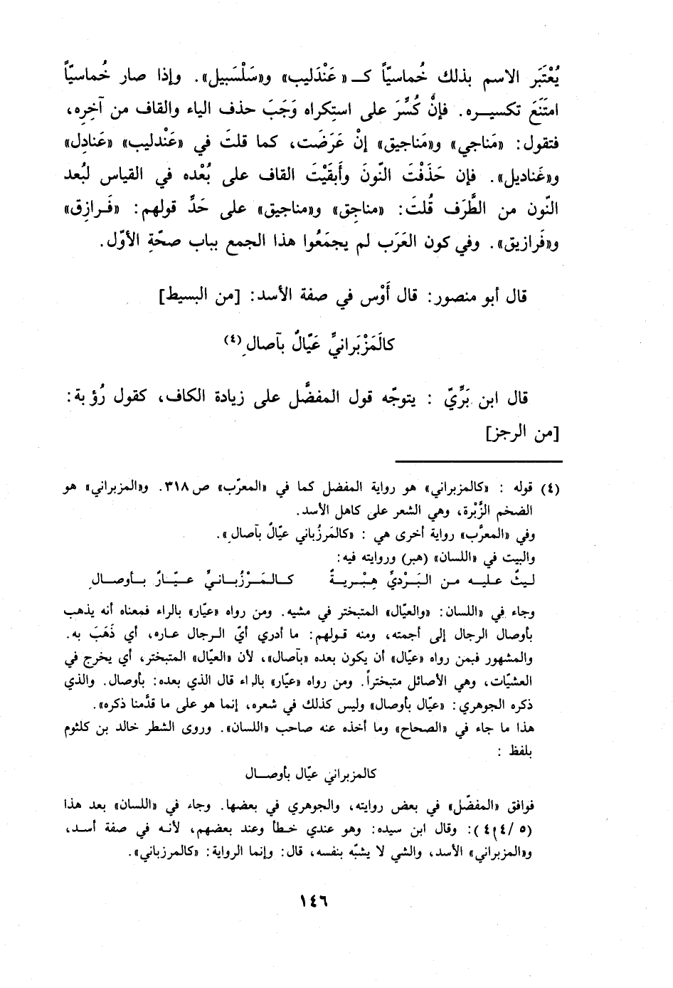 يعْتَبر الإسم بذلك خماسيا ك عندليب وسلسبيل وَإِذا صَار خماسيا امْتنع تكسيره فَإِن كسر على استكراه وَجب حذف الْيَاء وَالْقَاف من آخِره فَتَقول مناجي ومناجيق إِن عرضت كَمَا قلت فِي عندليب عنادل وعناديل فَإِن حذفت النُّون وأبقيت الْقَاف على بعده فِي الْقيَاس لبعد النُّون من الطّرف قلت مناجق ومناجيق على حد قَوْلهم فرازق وفرازيق وَفِي كَون الْعَرَب لم يجمعوا هَذَا الْجمع بِبَاب صِحَة الأول