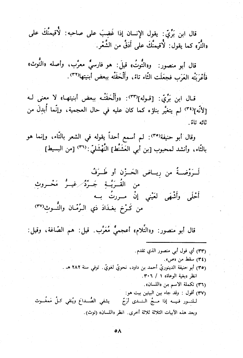 قَالَ أَبُو مَنْصُور والتوت قيل هُوَ فَارسي مُعرب وَأَصله التوث فأعربته الْعَرَب فَجعلت الثَّاء تَاء وألحقته بِبَعْض أبنيتها