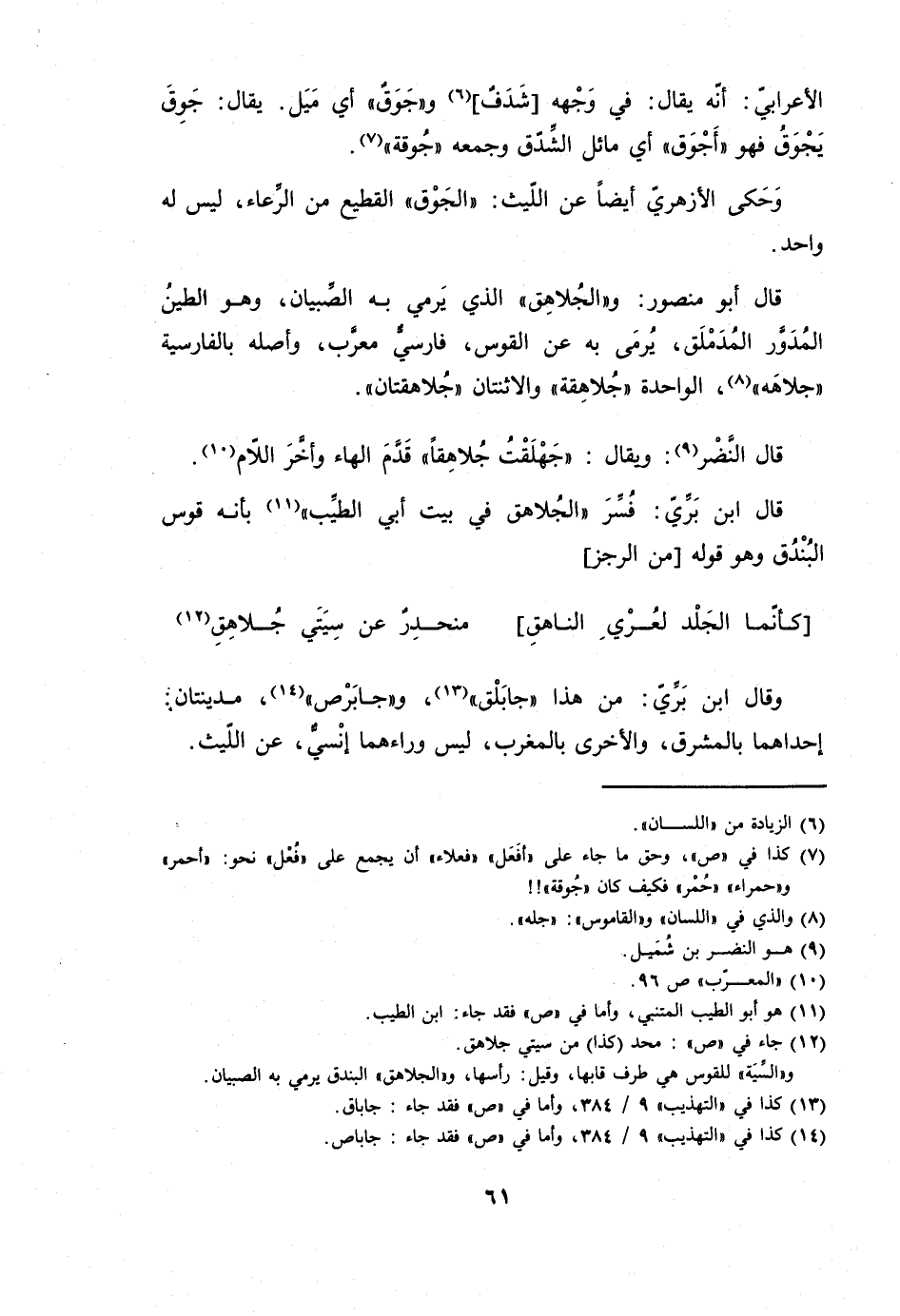 قَالَ أَبُو مَنْصُور والجلاهق الَّذِي يَرْمِي بِهِ الصّبيان وَهُوَ الطين المدور المدملق يرْمى بِهِ عَن الْقوس فَارسي مُعرب وَأَصله بِالْفَارِسِيَّةِ جلاهه الْوَاحِدَة جلاهقة والاثنتان جلاهقتان