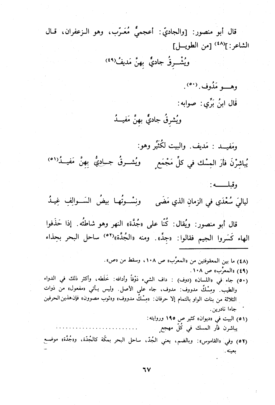 قَالَ أَبُو مَنْصُور والجادي أعجمي مُعرب وَهُوَ الزَّعْفَرَان قَالَ الشَّاعِر