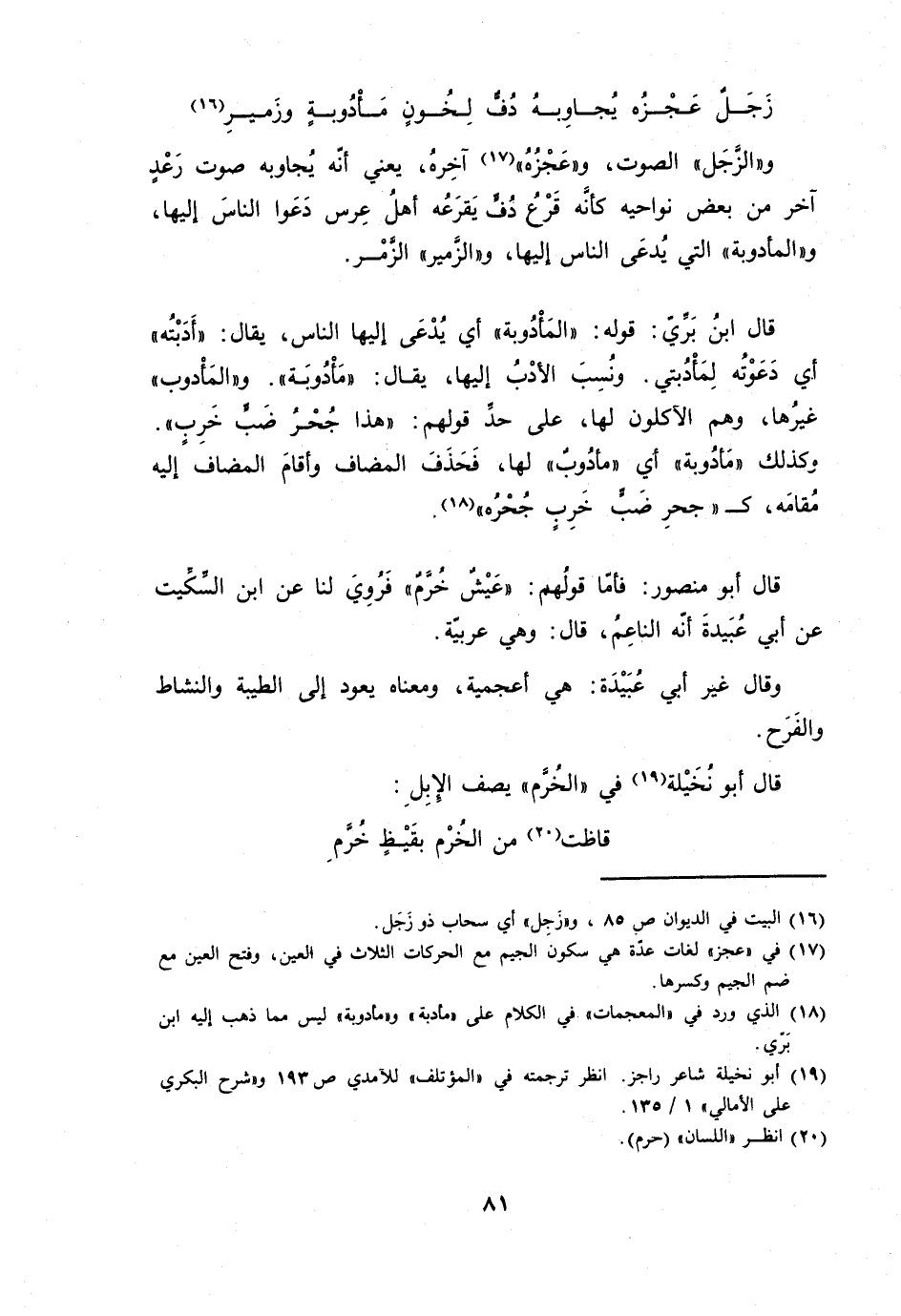 والزجل الصَّوْت وعجزه آخِره يَعْنِي أَنه يجاوبه صَوت رعد آخر من بعض نواحيه كَأَنَّهُ قرع دف يقرعه أهل عرس دعوا النَّاس إِلَيْهَا والمأدوبة الَّتِي يدعى النَّاس إِلَيْهَا والزمير الزمر