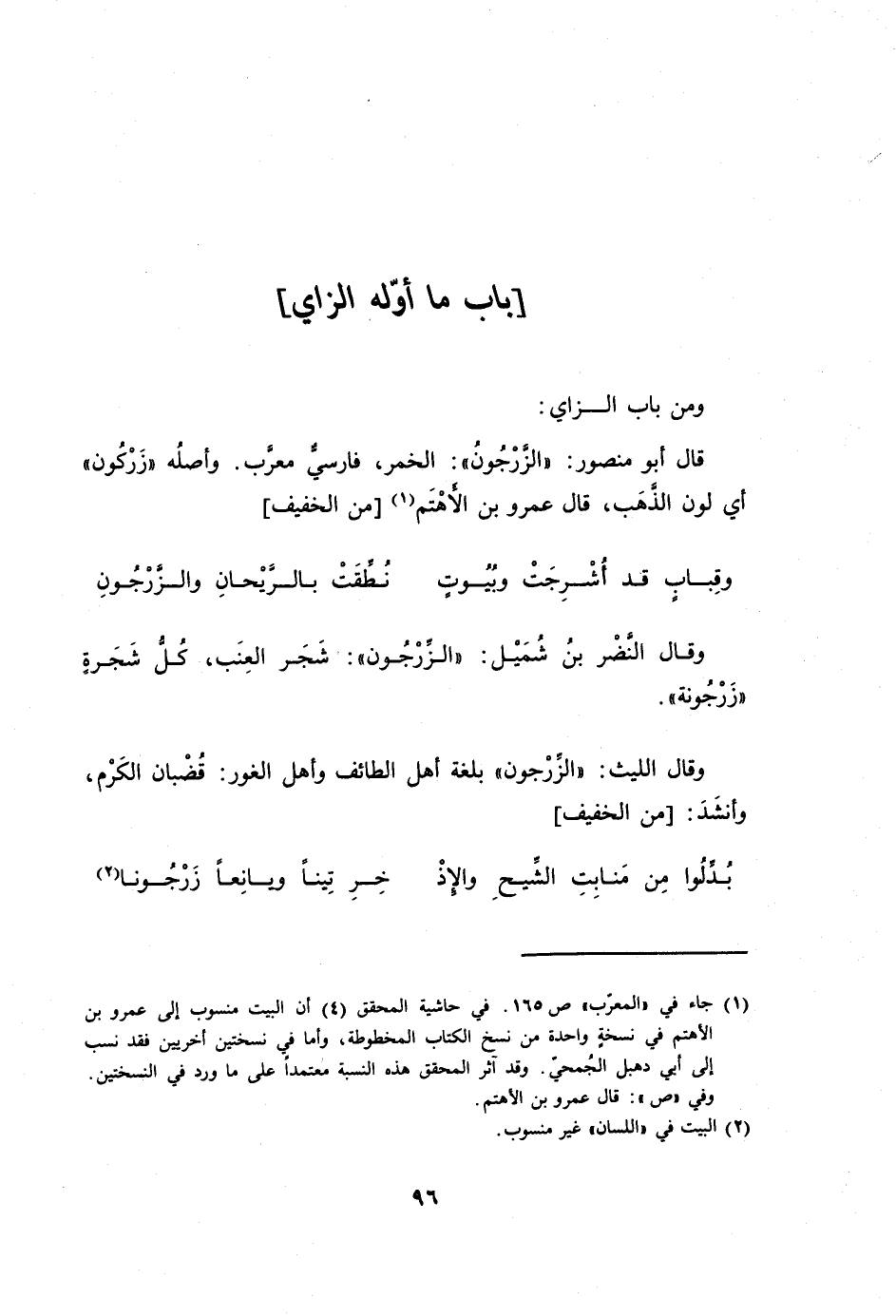 قَالَ أَبُو مَنْصُور الزرجون الْخمر فَارسي مُعرب وَأَصله زركون أَي لون الذَّهَب قَالَ عَمْرو بن الْأَهْتَم