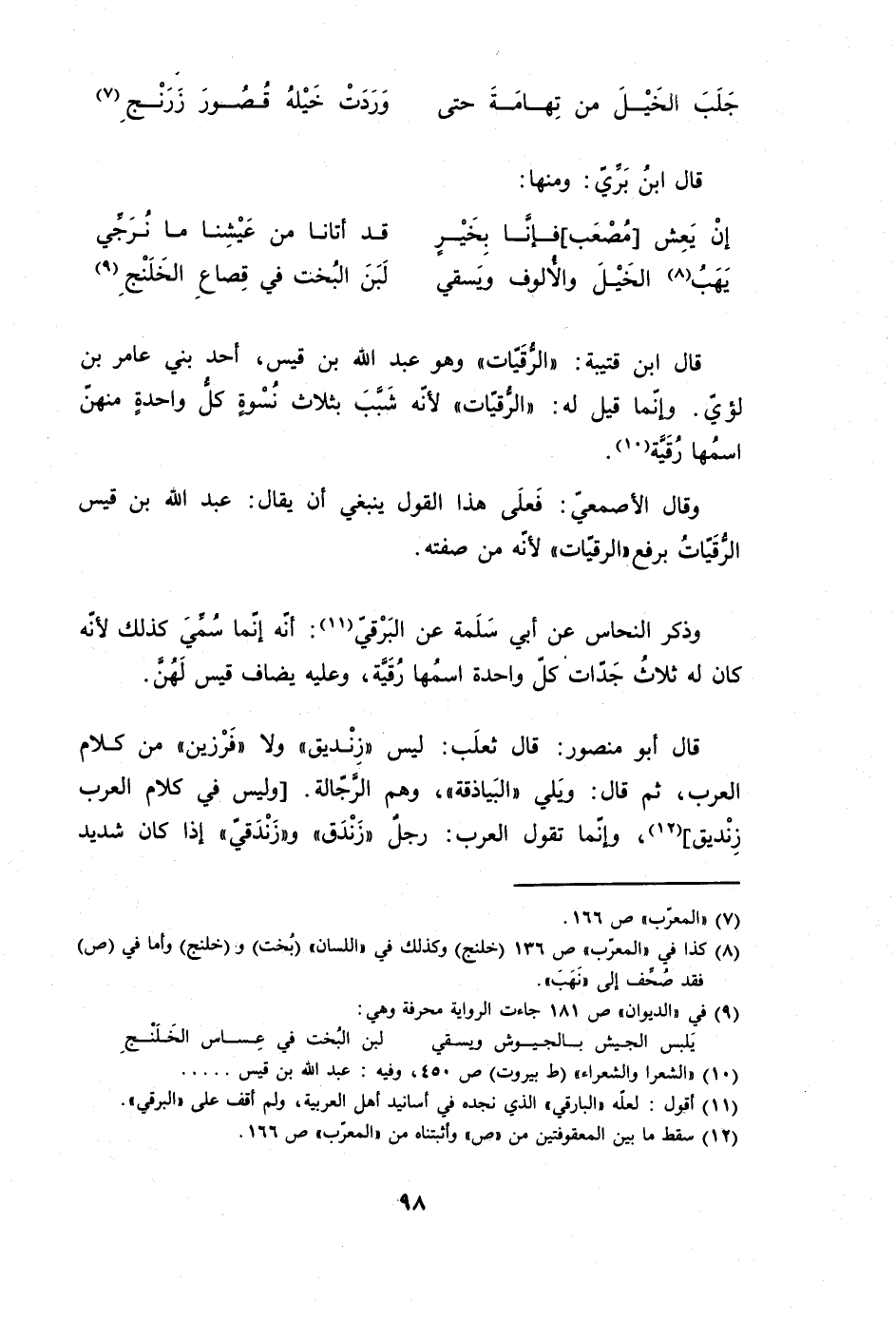 قَالَ أَبُو مَنْصُور قَالَ ثَعْلَب لَيْسَ زنديق وَلَا فرزين من كَلَام الْعَرَب ثمَّ قَالَ ويلي البياذقة وهم الرجالة وَلَيْسَ فِي كَلَام الْعَرَب زنديق وَإِنَّمَا تَقول الْعَرَب رجل زندق وزندقي إِذا كَانَ شَدِيد