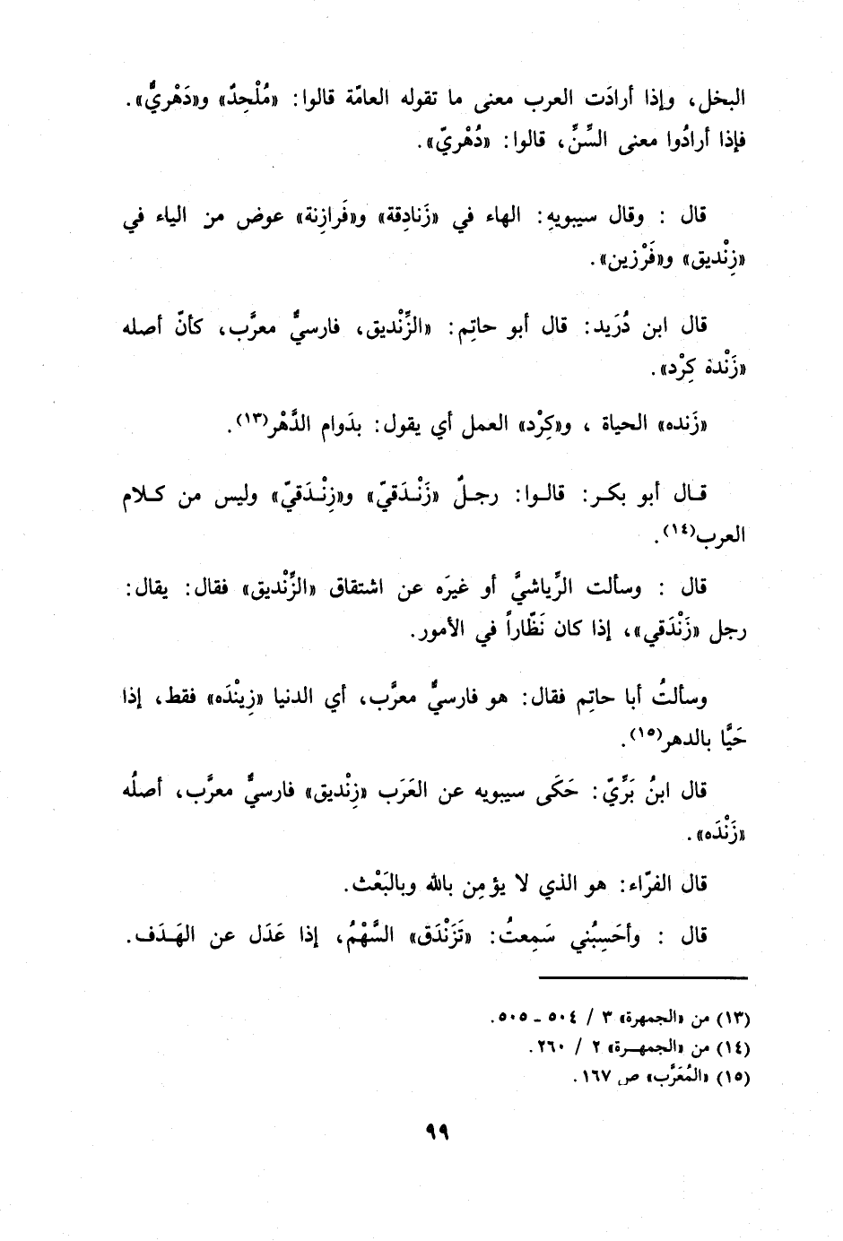 قَالَ أَبُو بكر قَالُوا رجل زندقي وزندقي وَلَيْسَ من كَلَام الْعَرَب