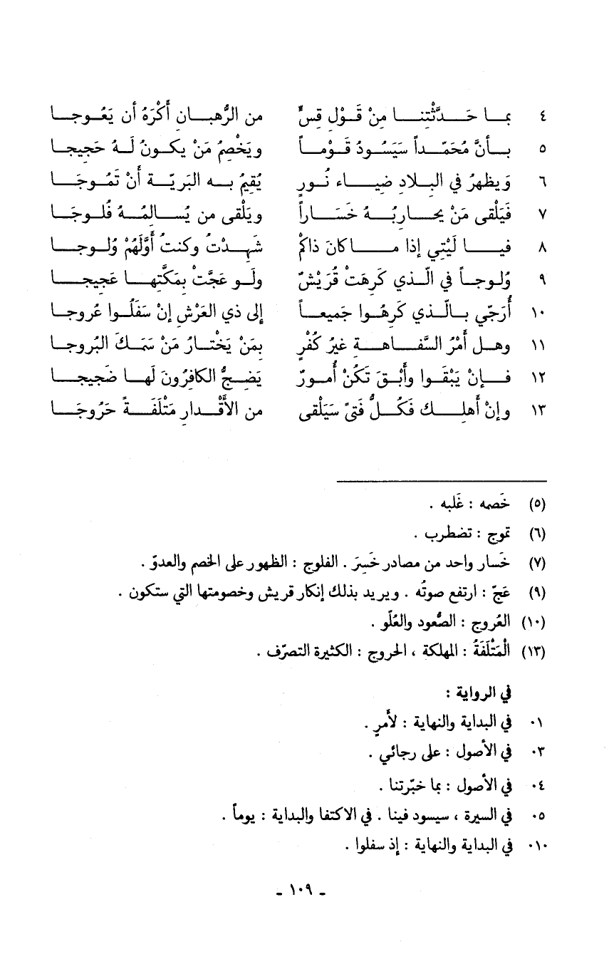 (وَيظْهر فِي الْبِلَاد ضِيَاء نورٍ ... يُقيم بِهِ الْبَريَّة أَن تموجا)
