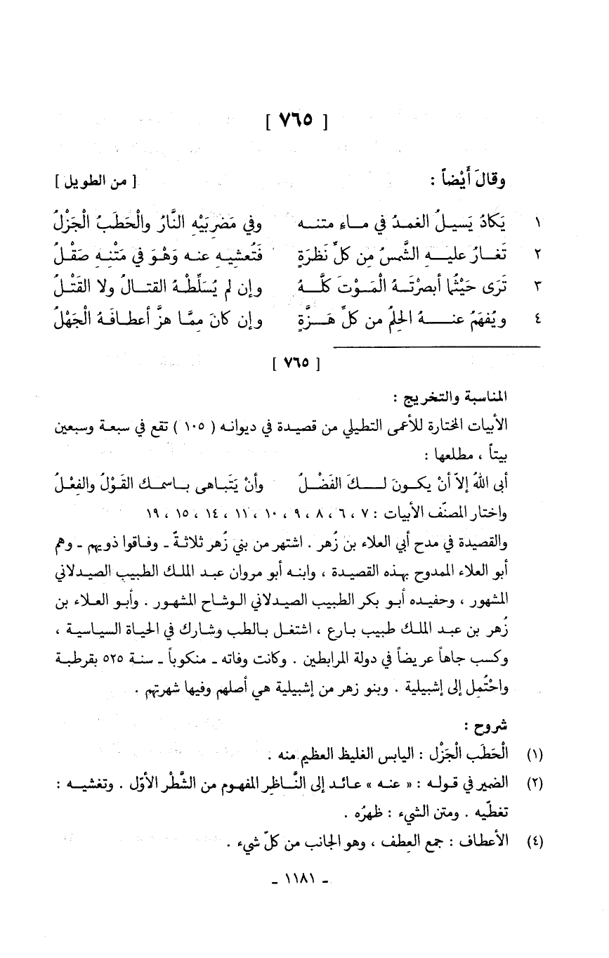 (يَكادُ يَسيلُ الغمدُ فِي ماءِ مَتنه ... وَفِي مَضرِبْيْةِ النَّارُ والْخَطبُ الْجَزْلُ)