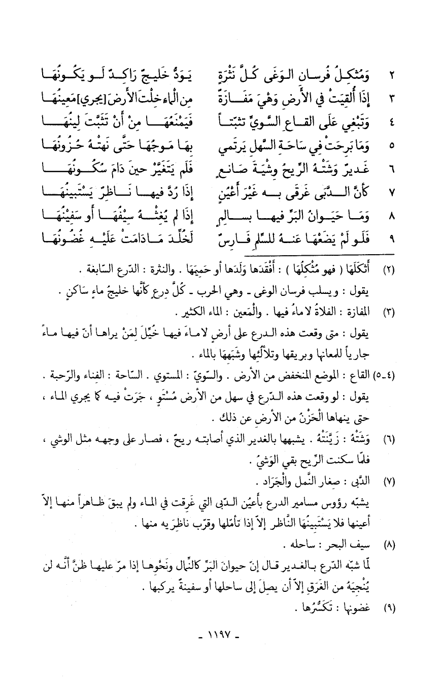 (وَمُثكِلُ فُرسانِ الوَغَى كُلَّ نَثْرَةٍ ... يَوَدُّ خَليجٌ رَاكِدٌ لَو يَكُونُهَا)