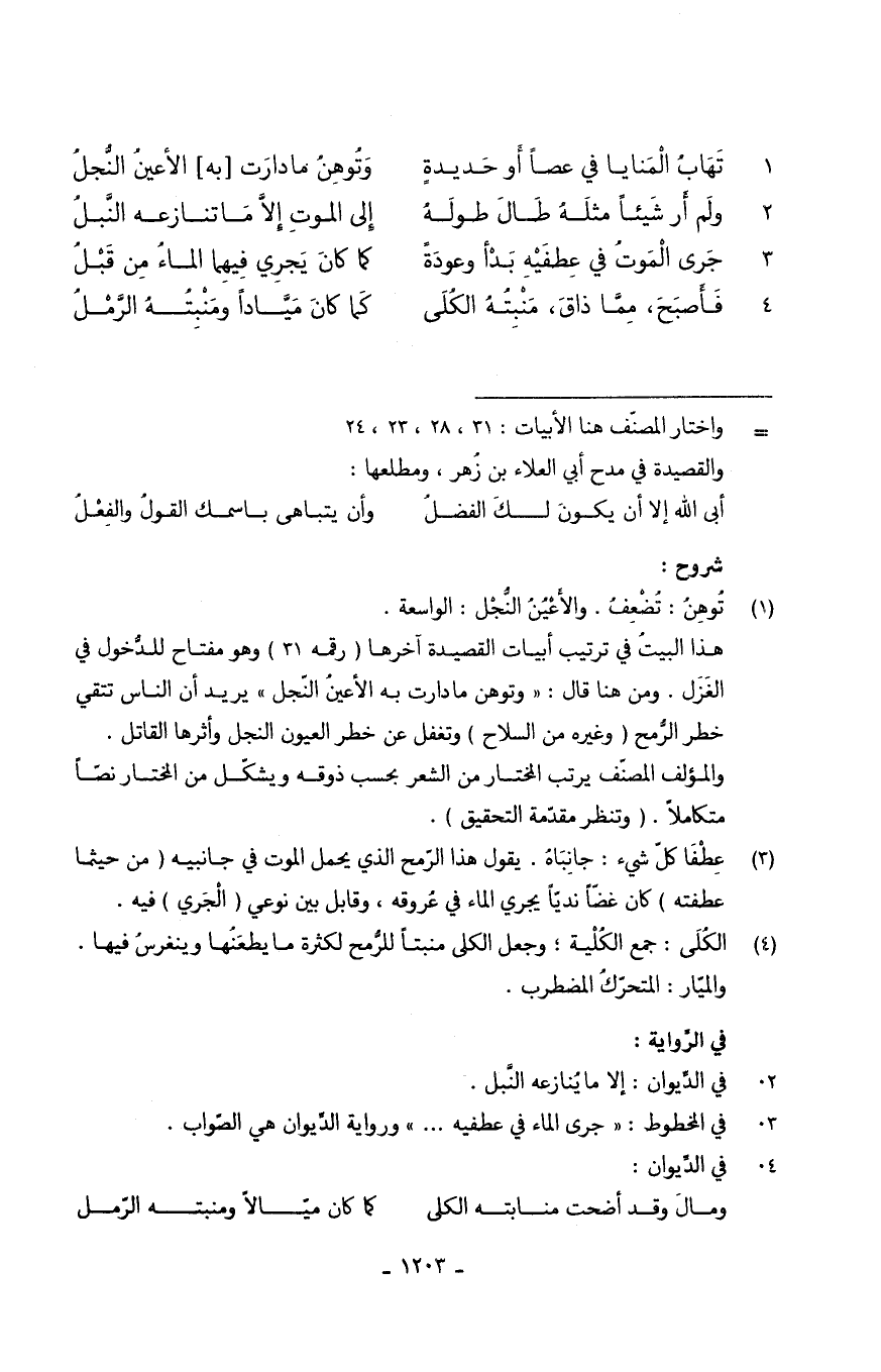 (تَهَابُ الْمَنايا فِي عَصا أَو حَديدةٍ ... وَتُوهِنُ مَا دارَت بِهِ الأعينُ النَّجلُ)