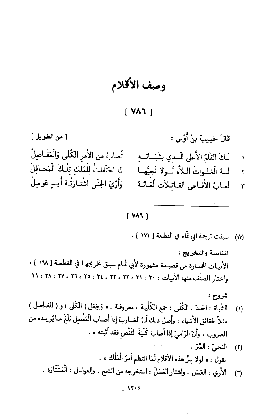 (لَكَ القَلَمٌ الأَعلى الّذِي بِشَبَاتهِ ... تًصابُ من الأمرِ الكُلَى وَالْمَفَاصِلُ)