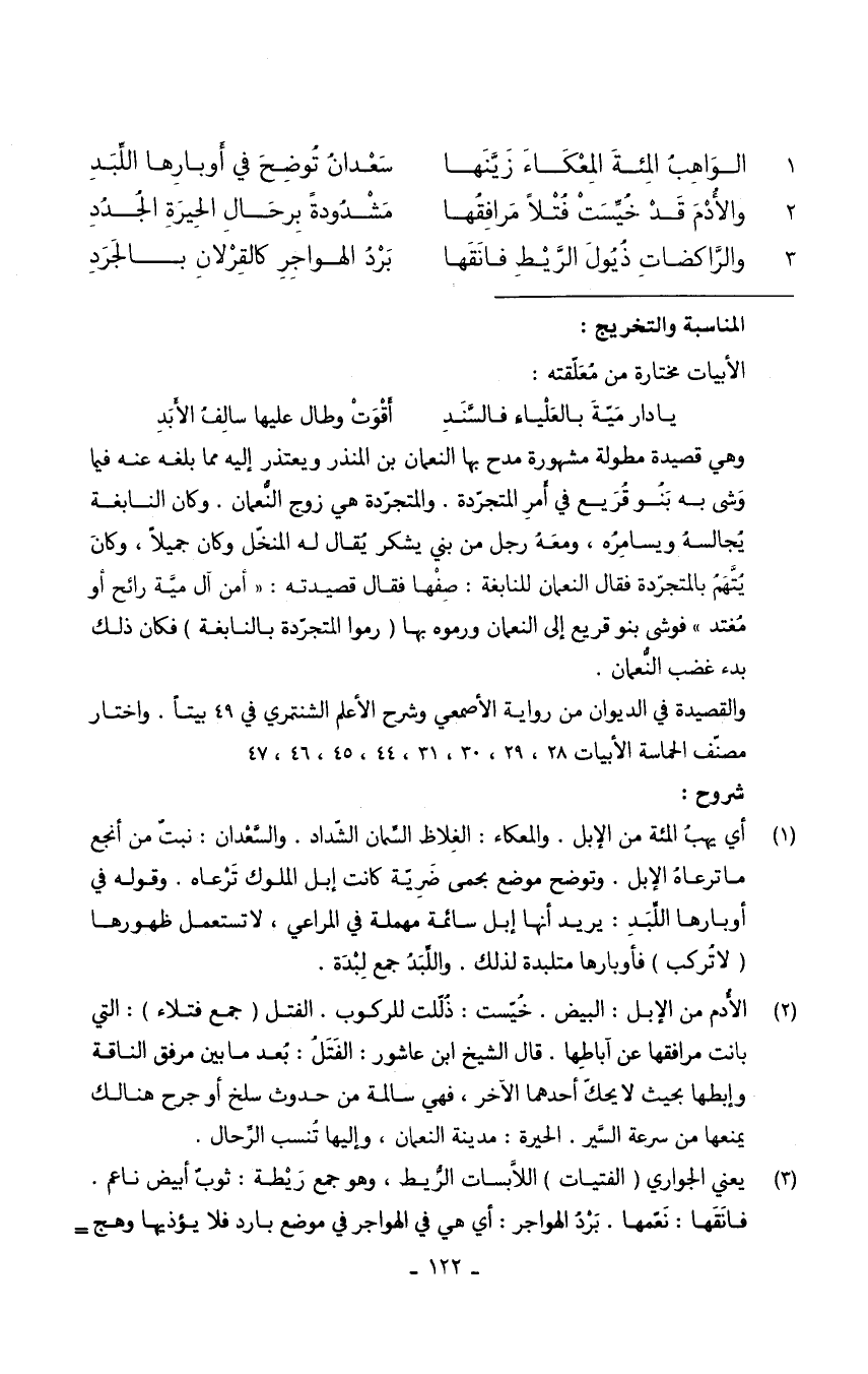 (الْوَاهِب المئة المعكاء زينها ... سَعْدَان توضح فِي أوبارها اللبد)