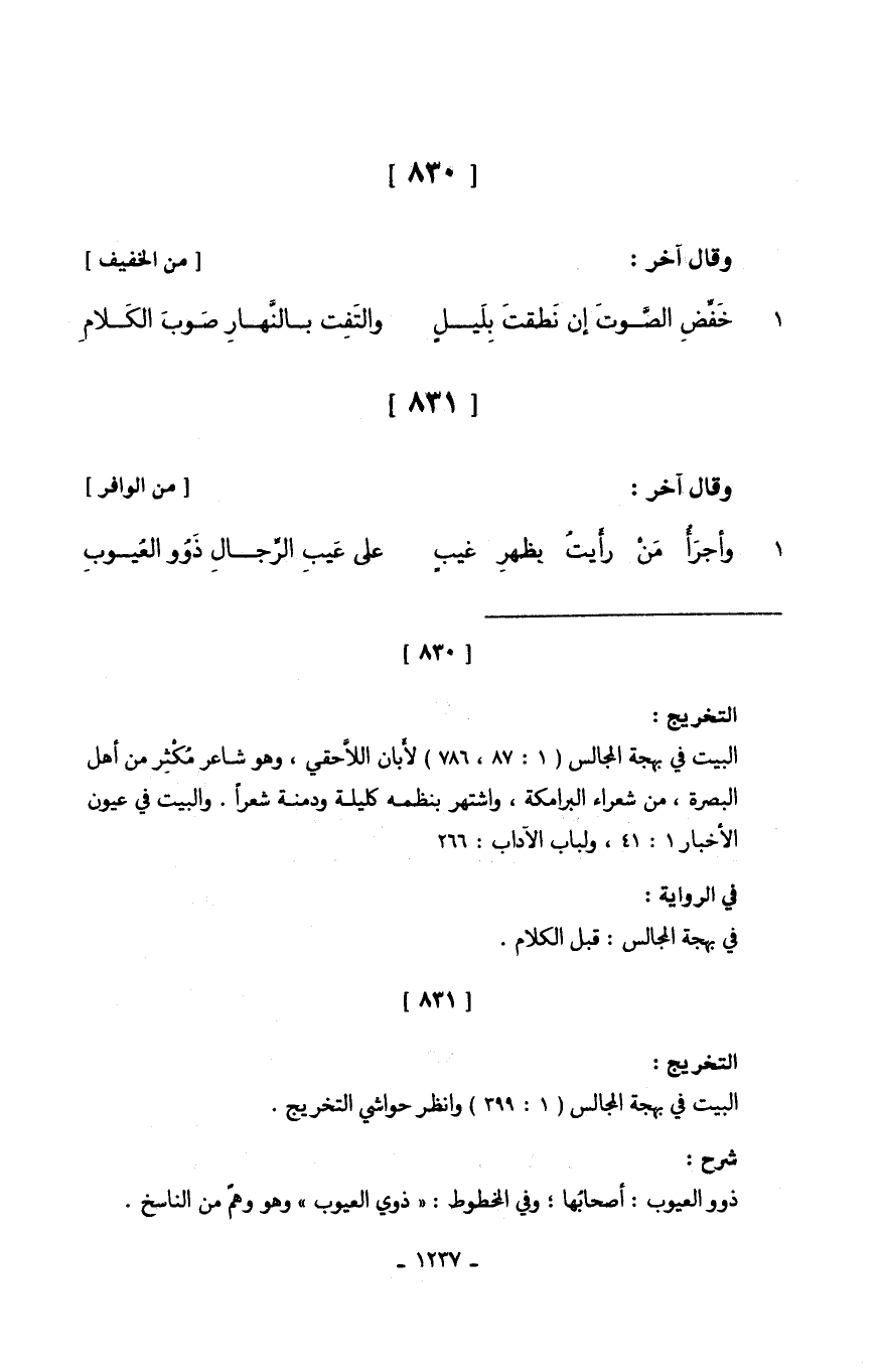 (خَفِّضِ الصِّوتَ إِن نَطقتَ بِلَيلِ ... والتَفِت بالنَّهارِ صَوبَ الكَلامِ)