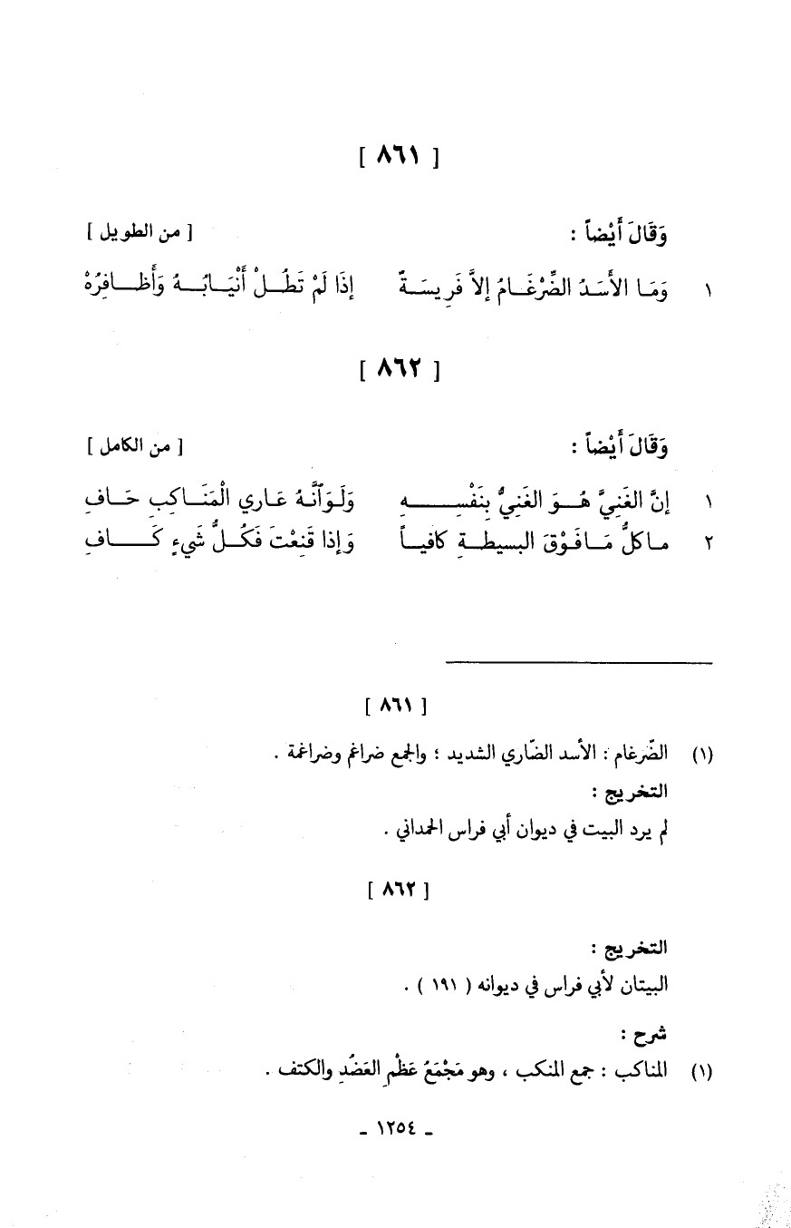 (إنَّ الغَنِيَّ هُوَ الغَنِيُّ بِنَفْسه ... وَلَوَ أنَّهَ عَاري الْمَنَاكِبِ حَافِ)