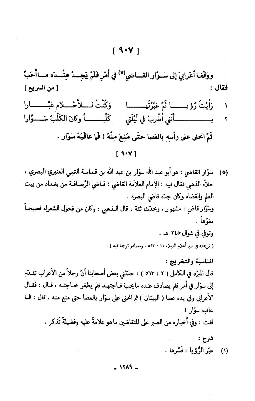 ووَقَفَ أعْرابيّ إِلَى سَوَّار القَاضِي فِي أَمْرِ فَلَمْ يَجِدْ عِنْدَه مَا أَحَبَّ فَقال // (من السَّرِيع) // 1.