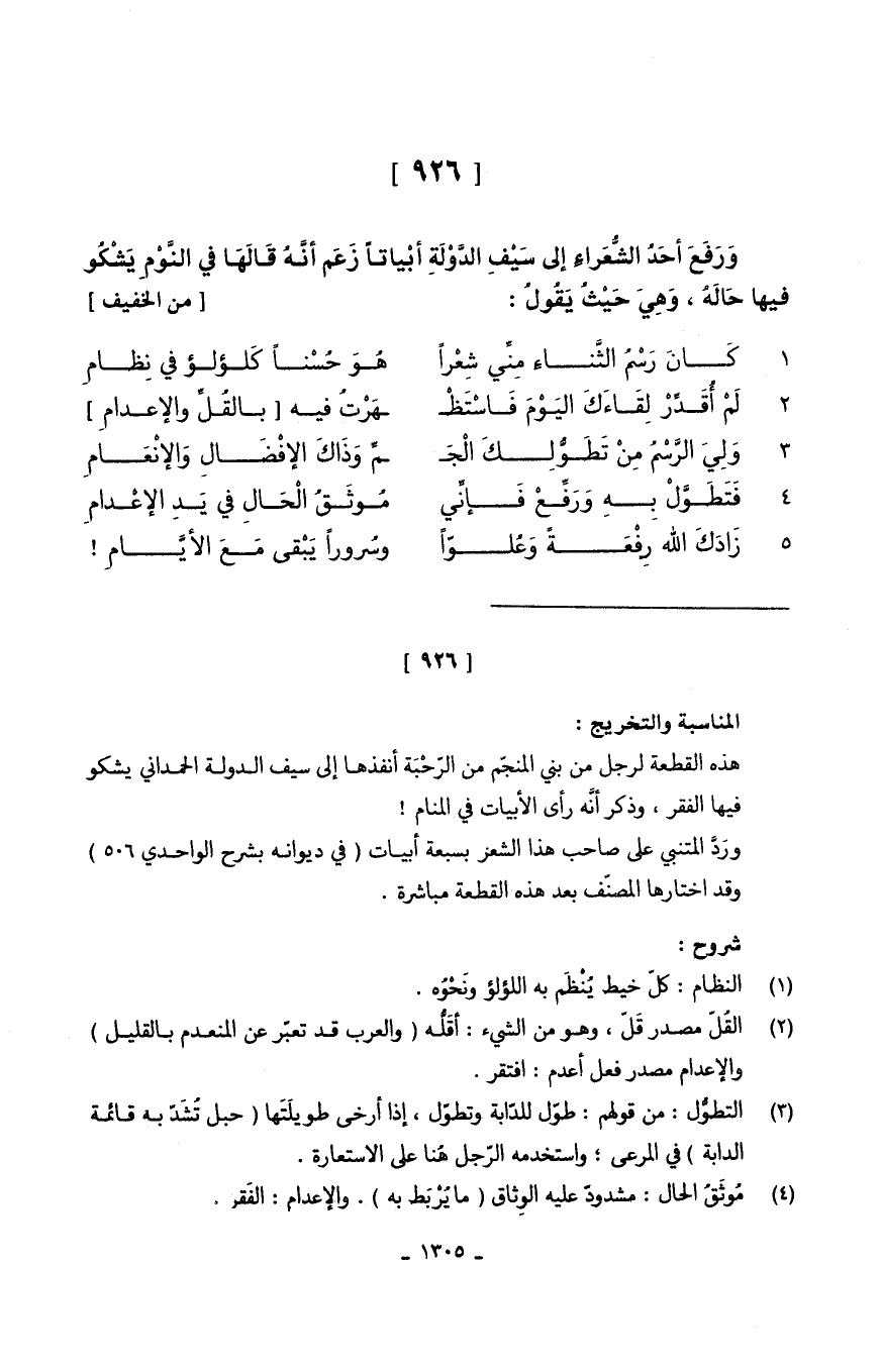 وَرَفََعَ أحَدُ الشُّعرَاءٍ إِلَى سَيْفِ الدَّوْلَةِ أبْياناً زَعَم أنَّهُ قَالَهَا فِي النَّوْمِ يَشْكُو فِيهَا حَالَةُ وَهِي حََيْثُ يَقُولُ // (من الْخَفِيف) // 1.