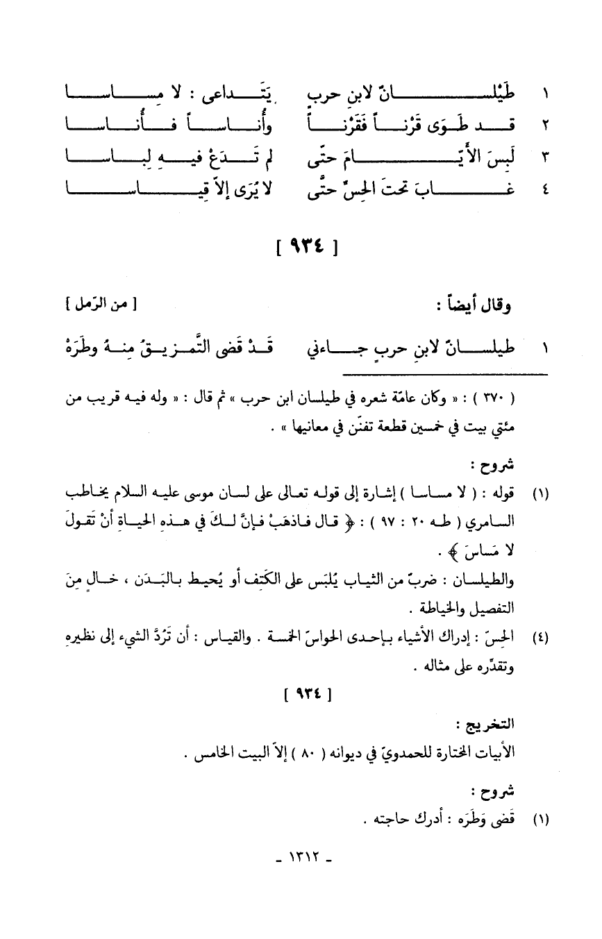 (طيلسانٌ لابنِ حربٍ جَاءَنِي ... قَدْ قَضى التَّمزيقُ مِنهُ وطَرَهْ)