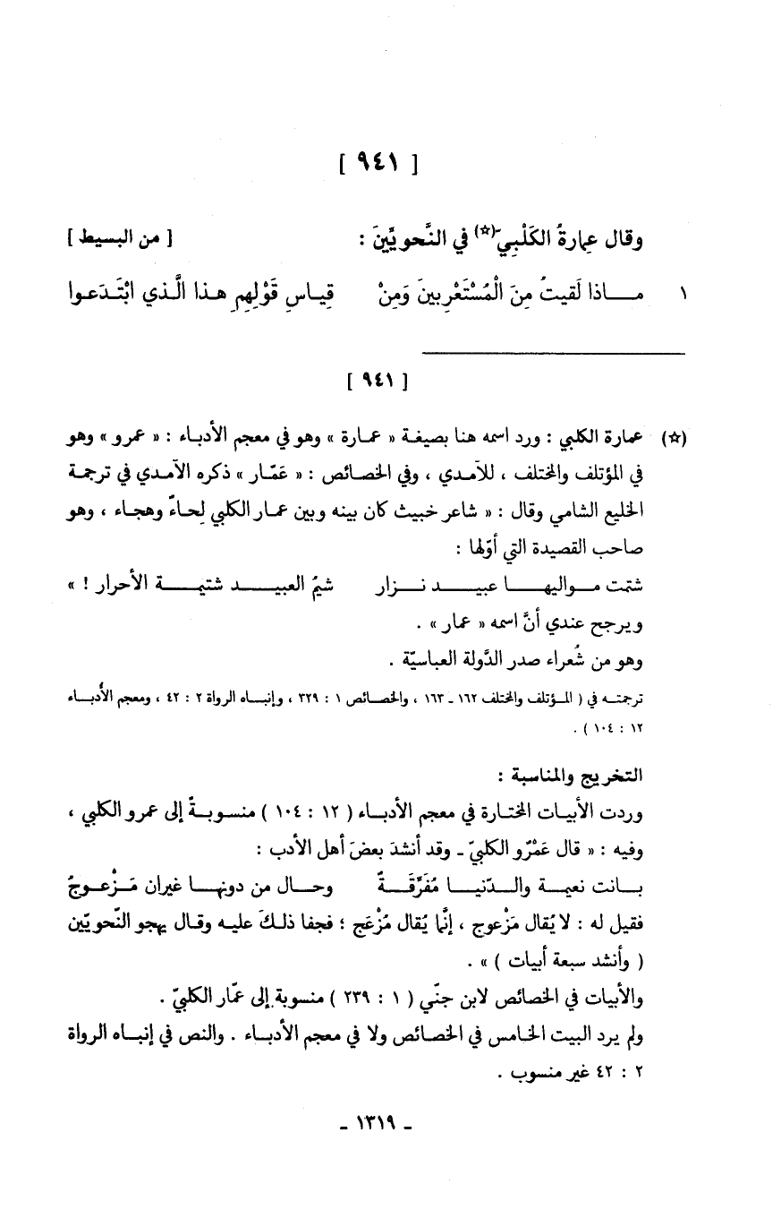 وَقَالَ عِمارةُ الكَلْبِيّ فِي النَّحويِّين // (من الْبَسِيط) // 1.