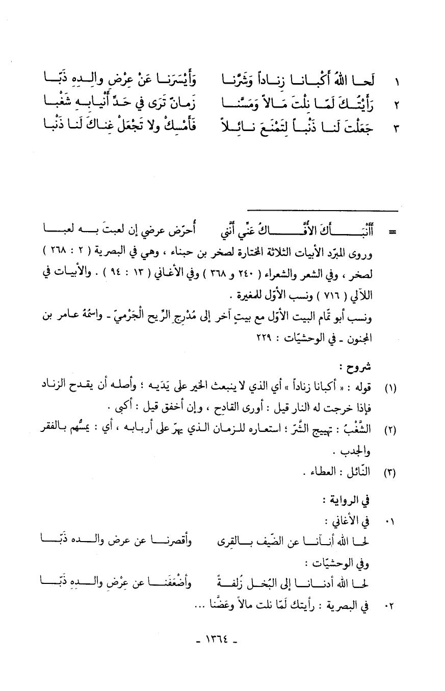 (جَعَلْتَ لَنا ذَنْباً لِتَمْنَعَ نائِلاً ... فَأَمْسِكْ وَلَا تَجْعِلْ غِناكَ لَنا ذَنْبا)