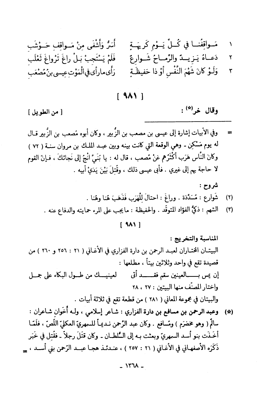(وَلوْ كَانَ شَهْمَ النَّفسِ أوْ ذَا حَفيظَةِ ... رَأَى مَا رأى فِي الْمَوْتِ عِيسى بنُ مُصعَبِ)
