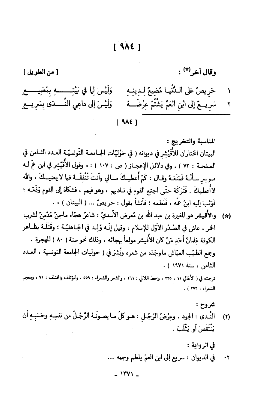 (حَرِيصٌ عَلى الدُّنْيا مَضِيعٌ لَديِنِهِ ... وَلَيْسَ لِما فِي بَيْتِهِ بِمُضِيعِ)