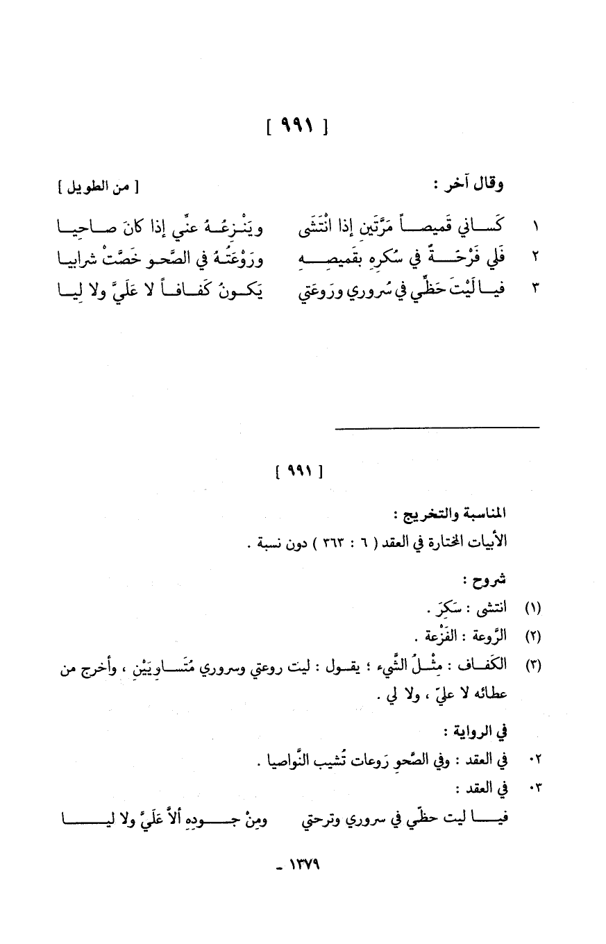 (فَلي فَرْحَةٌ فِي سُكرِهِ بقَميصِهِ ... ورَعَتُهُ فِي الصَّحو خَصَّتْ شرابيا)